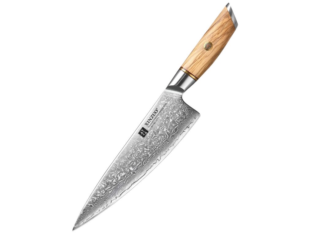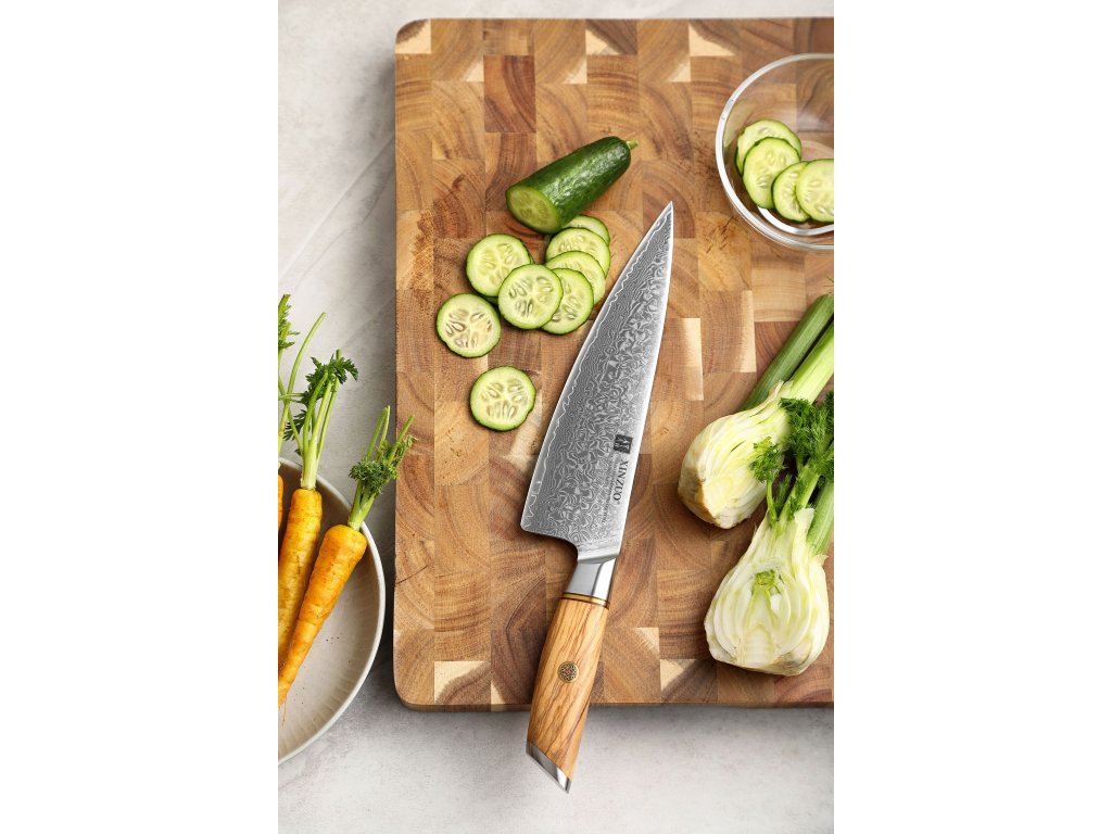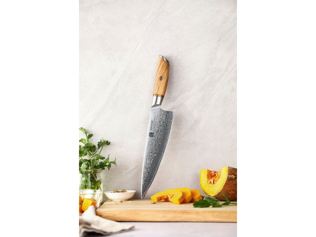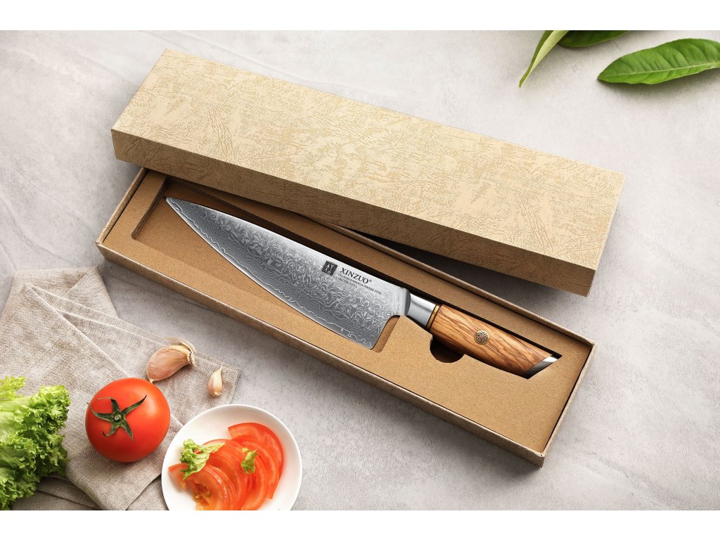 Das Premium-Kochmesser XinZuo Lan B37, 8,3-Zoll ist ein Design-Schmuckstück mit einer Damastklinge und Griff aus Olivenholz. Die hervorragende Ergonomie gehört zu seinen Vorteilen.
