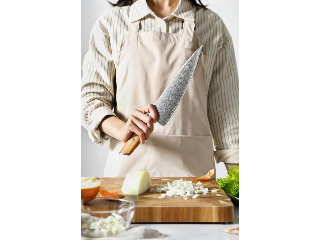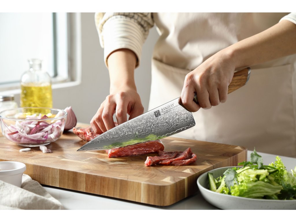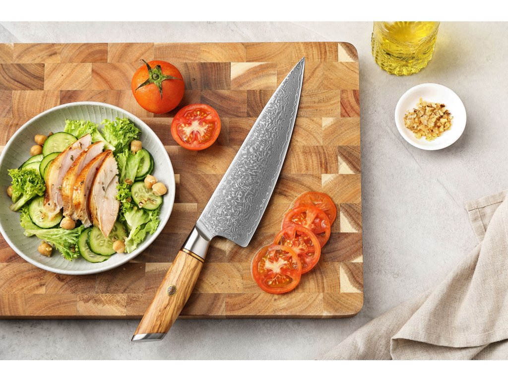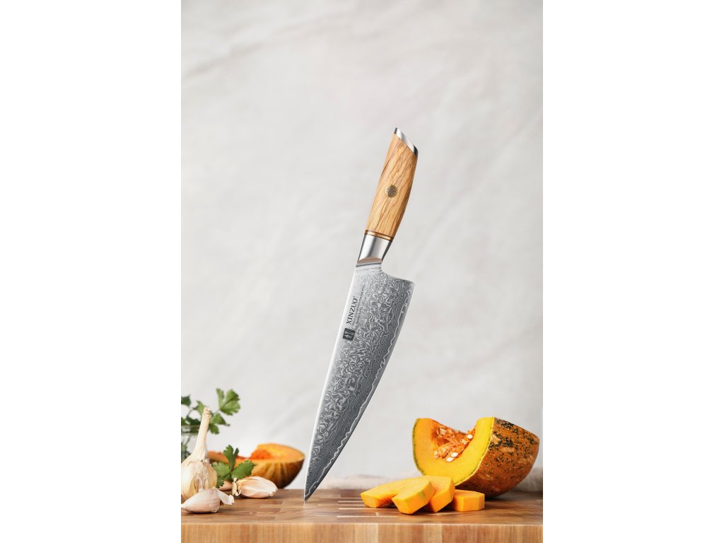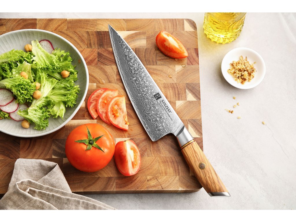 Das Premium-Kochmesser XinZuo Lan B37, 8,3-Zoll ist ein Design-Schmuckstück mit einer Damastklinge und Griff aus Olivenholz. Die hervorragende Ergonomie gehört zu seinen Vorteilen.