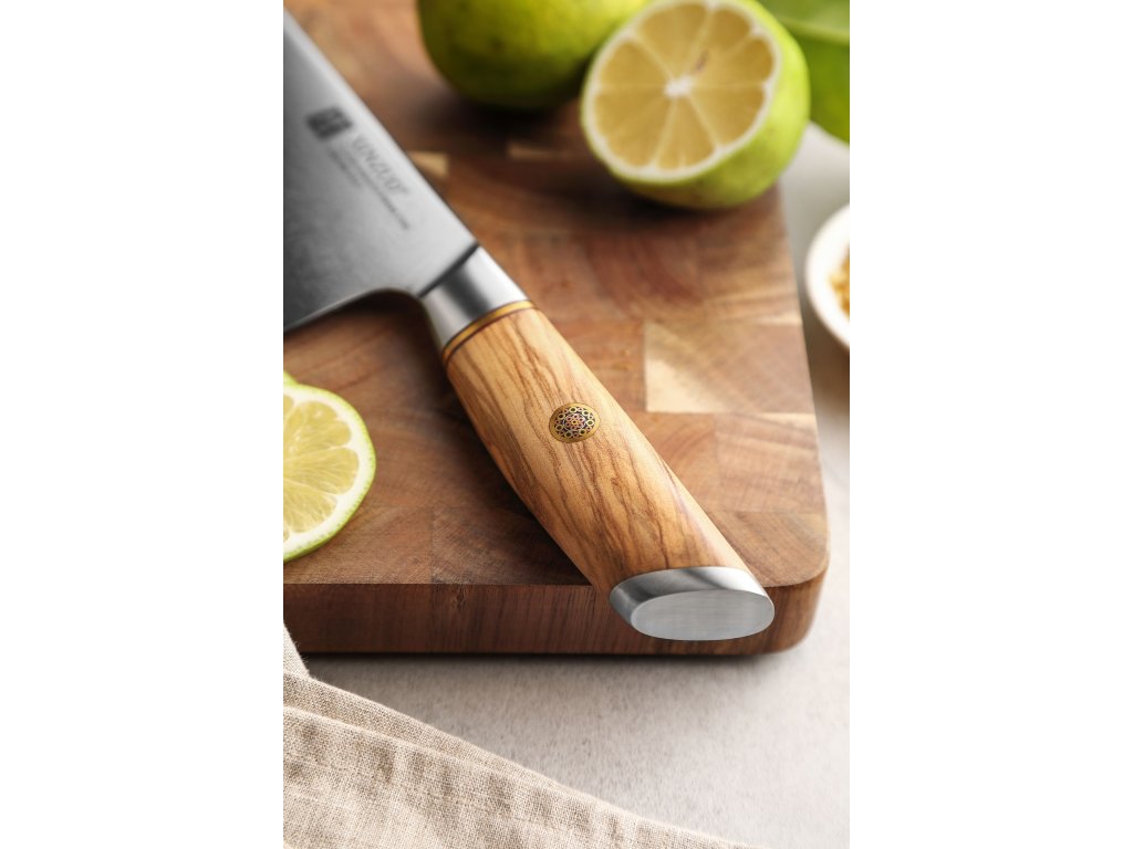 Der Griff des Messers ist aus hochwertigem Olivenholz gefertigt. Das Olivenholz ist eben wegen seiner Festigkeit und der interessanten Farb- und Maserungsvielfalt ideal für den Griff. Aufgrund des natürlichen Griff-Designs kann die Farbe und das Design leicht von den Produktbildern abweichen, da der Griff aus einem anderen Holzstück gefertigt wurde oder da das Alter des Olivenholzes unterschiedlich ist.