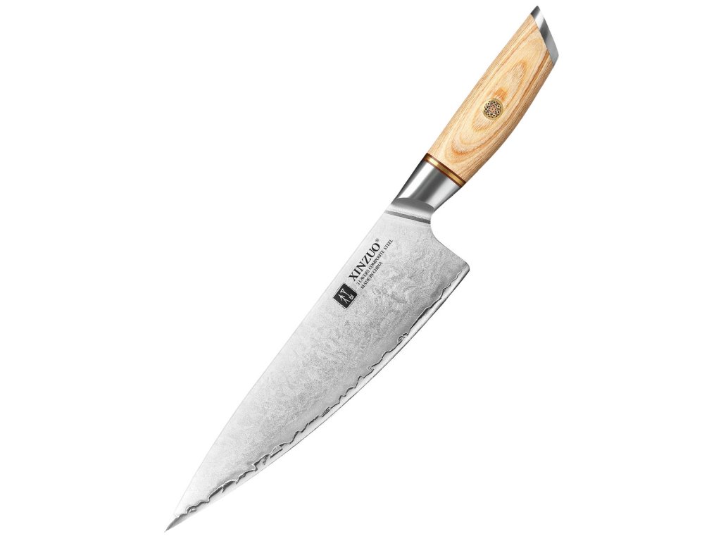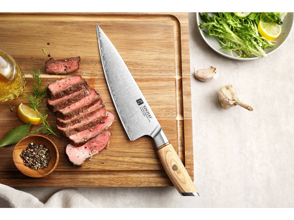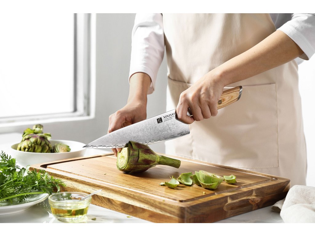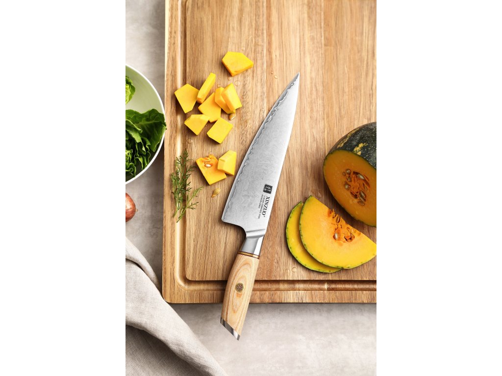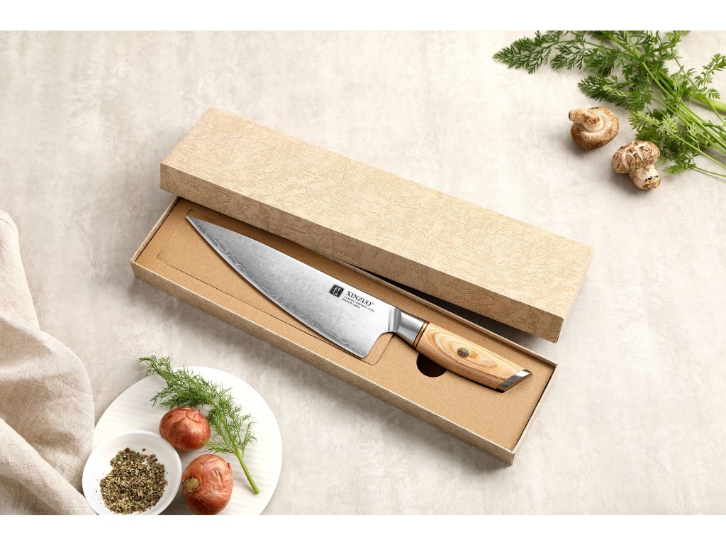 Das Premium Chefmesser XinZuo Lan B37S, 21 cm ist ein Schmuckstück mit Klinge aus Verbundstahl, Griff aus Pakkaholz und hervorragender Ergonomie.