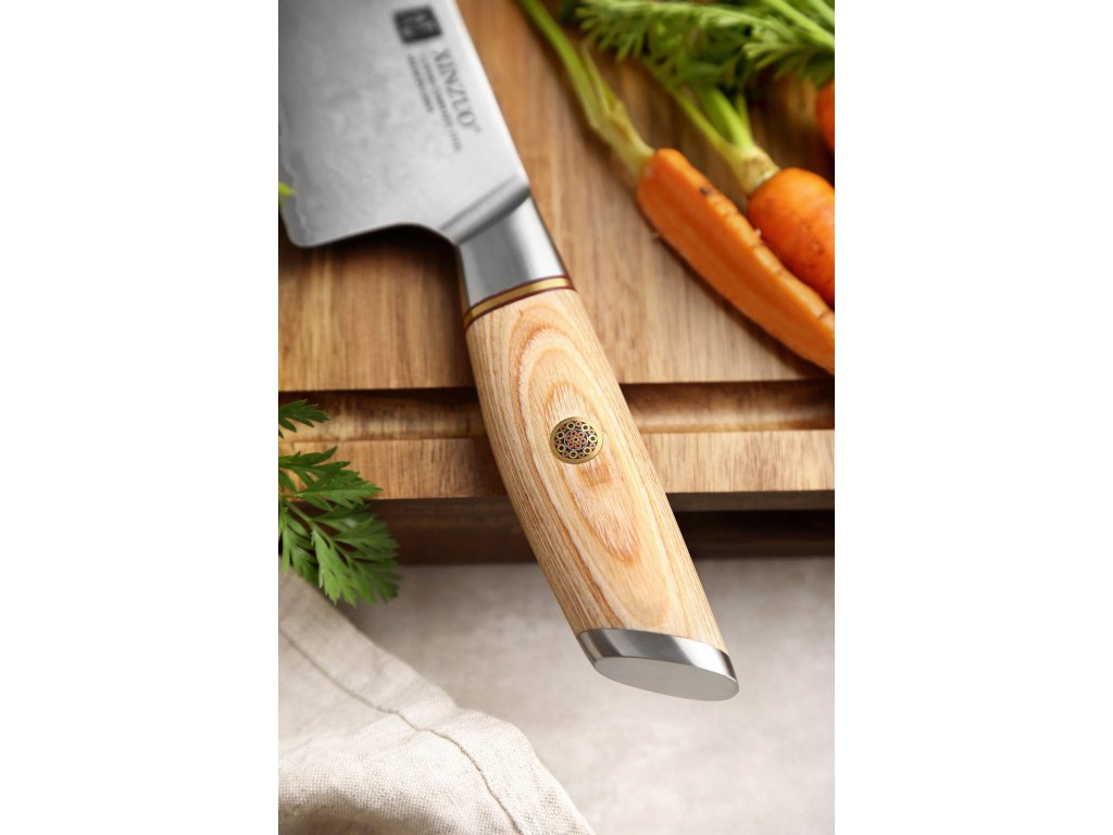 Der Messergriff ist aus hochwertigem Pakkaholz gefertigt, das für seine Härte, Langlebigkeit und Feuchtigkeitsbeständigkeit bekannt ist. Aufgrund des natürlichen Griff-Designs kann die Farbe und das Design leicht von den Produktbildern abweichen, da der Griff aus einem anderen Holzstück gefertigt wurde oder da das Alter des Pakkaholzes unterschiedlich ist. Bei der Gestaltung des Griffs wurde auf perfekte Ergonomie geachtet, um einen festen Griff und ein komfortables und langanhaltendes Schneiden zu gewährleisten. Dank seiner perfekten Form und Länge wird das Schneiden zum Vergnügen und außerdem liegt das Messer gut in der Hand.