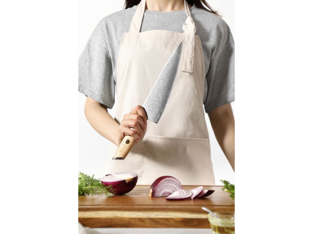 Dieses Chefmesser ist aus drei Lagen hochwertigem Verbundstahl gefertigt. Der Kern des Messers besteht aus 10Cr15CoMoV-Stahl und ist beidseitig durch rostfreien SUS410-Stahl gegen Korrosion geschützt. Das Messer hat eine Härte von 60±2 Rockwell. Hochwertiger Stahl in einer Kombination von traditioneller Herstellung garantiert eine lange Lebensdauer des Messers. Die Oberfläche des Messers bietet beim Schneiden Komfort, ohne dass es reibt oder dass die Zutaten an die Klinge pappen. Die Klinge ist von Messerschmieden nach japanischer Art in einem Winkel von 15° auf beiden Seiten handgeschliffen. Der Farbton des Musters auf der Klinge kann unterschiedlich sein, da jedes Messer durch das Stahlschichten einzigartig ist.