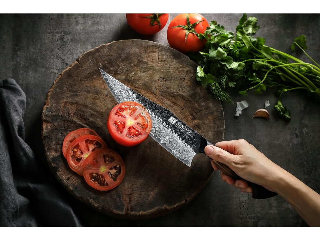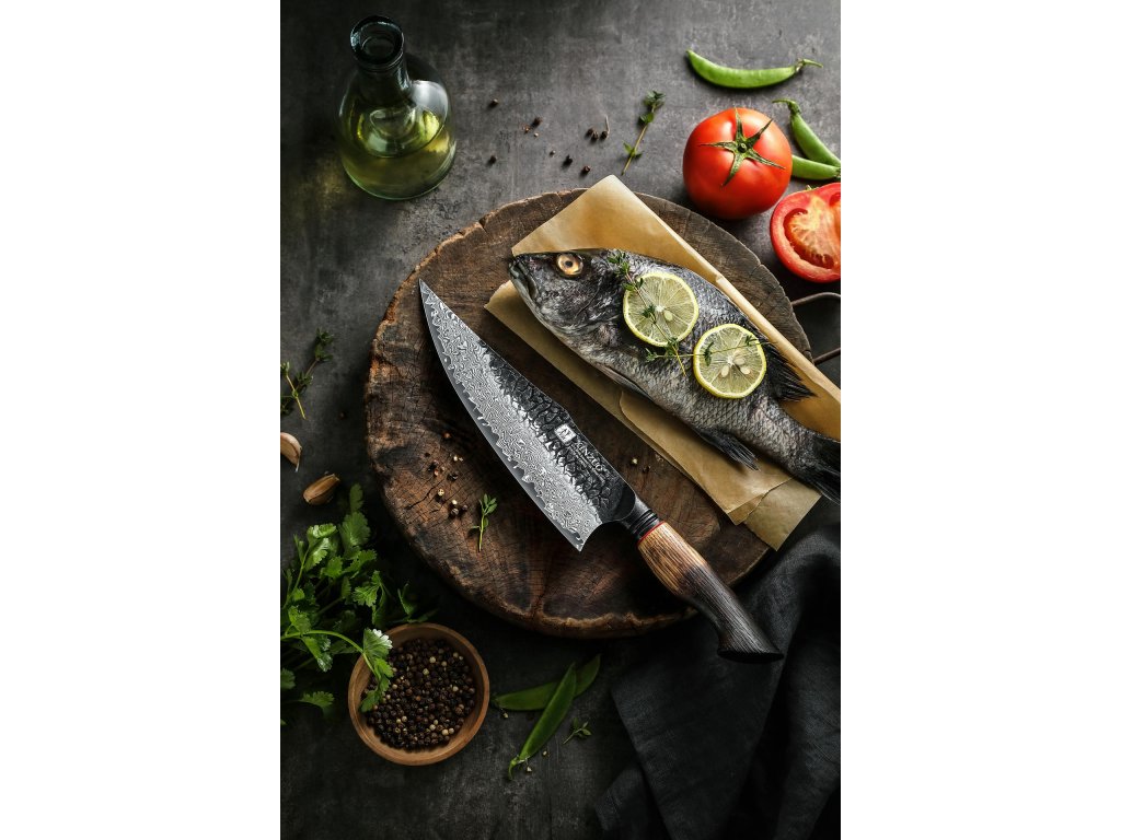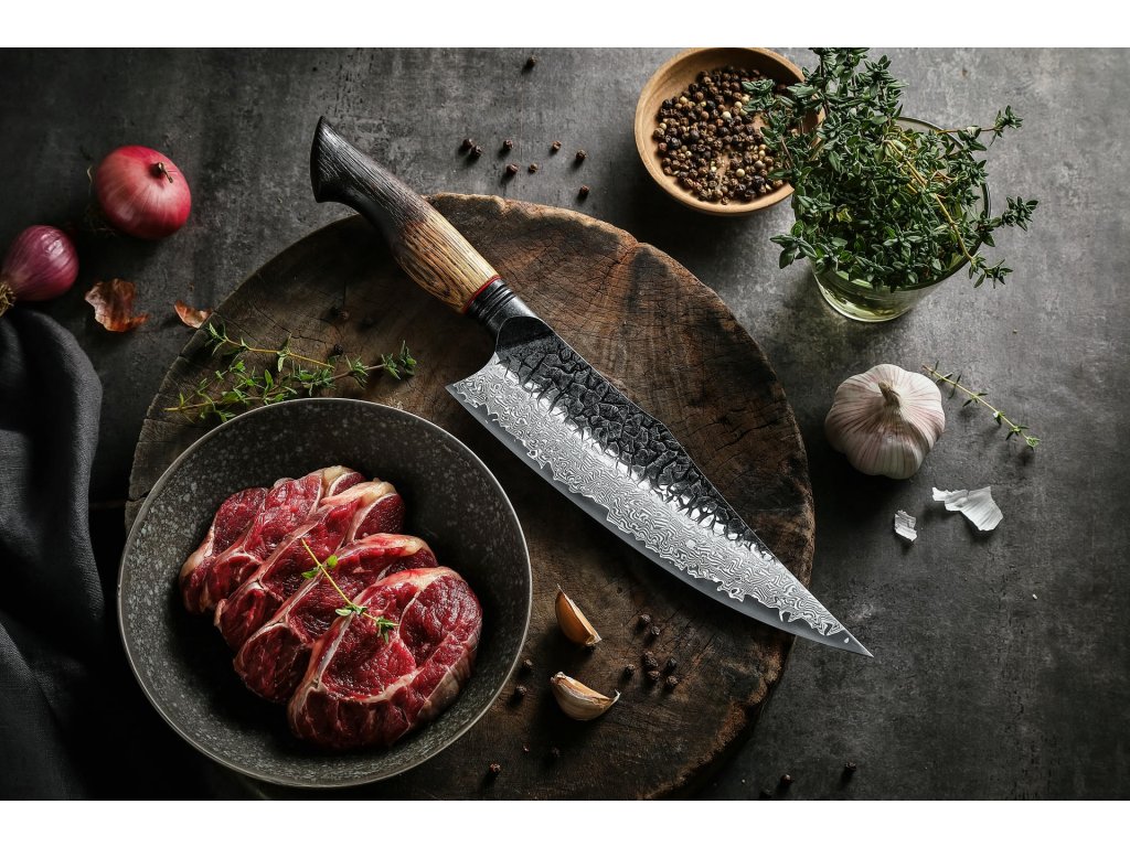 Dieses Chefmesser ist aus hochwertigem Damaszener Stahl gefertigt, der für die Herstellung der besten Messer verwendet wird. Die Messerklinge mit einer Härte von 60±2 Rockwell besteht aus 67 Lagen. Hochwertiger Stahl in einer Kombination von traditioneller Herstellung garantiert eine lange Lebensdauer des Messers. Die Oberfläche des Messers bietet beim Schneiden Komfort, ohne dass es reibt oder dass die Zutaten an die Klinge pappen. Die Messer werden beiderseitig von Messerschmieden von Hand mit einem Winkel von 15 ± 1° geschliffen.