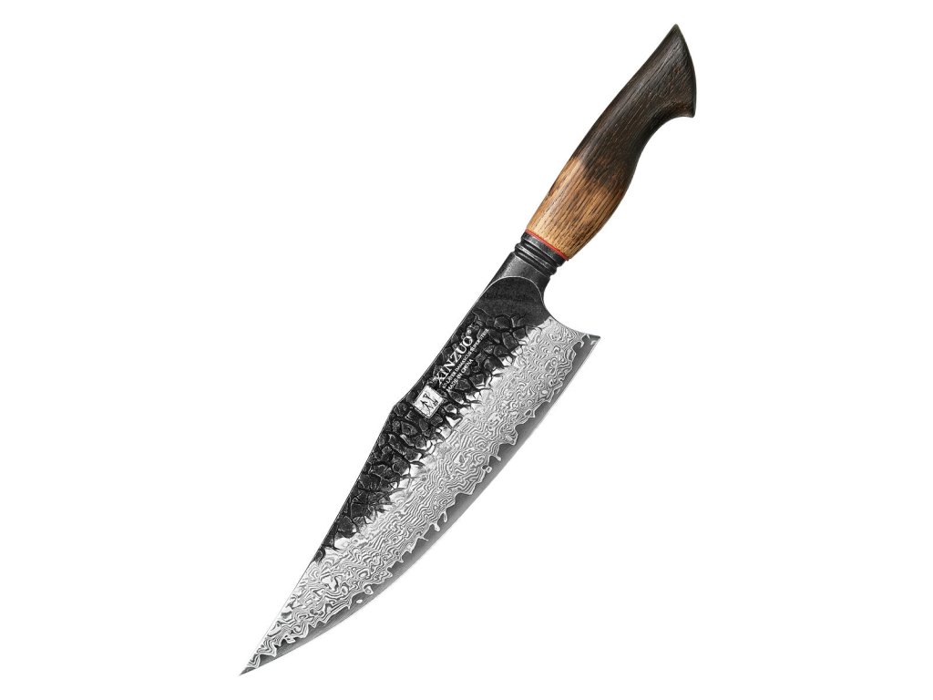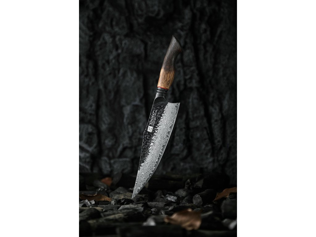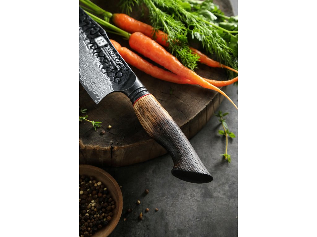 Ein Kochmesser XinZuo Mo X06 22 cm mit einzigartiger Damastklinge und handgefertigtem Eichenholzgriff, der fließend von einer hellen, warmen Farbe zu einer rauchigen, dunklen übergeht.