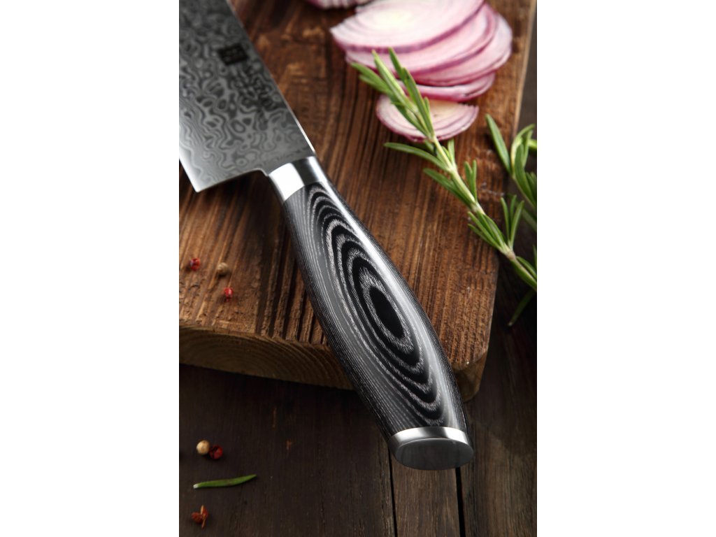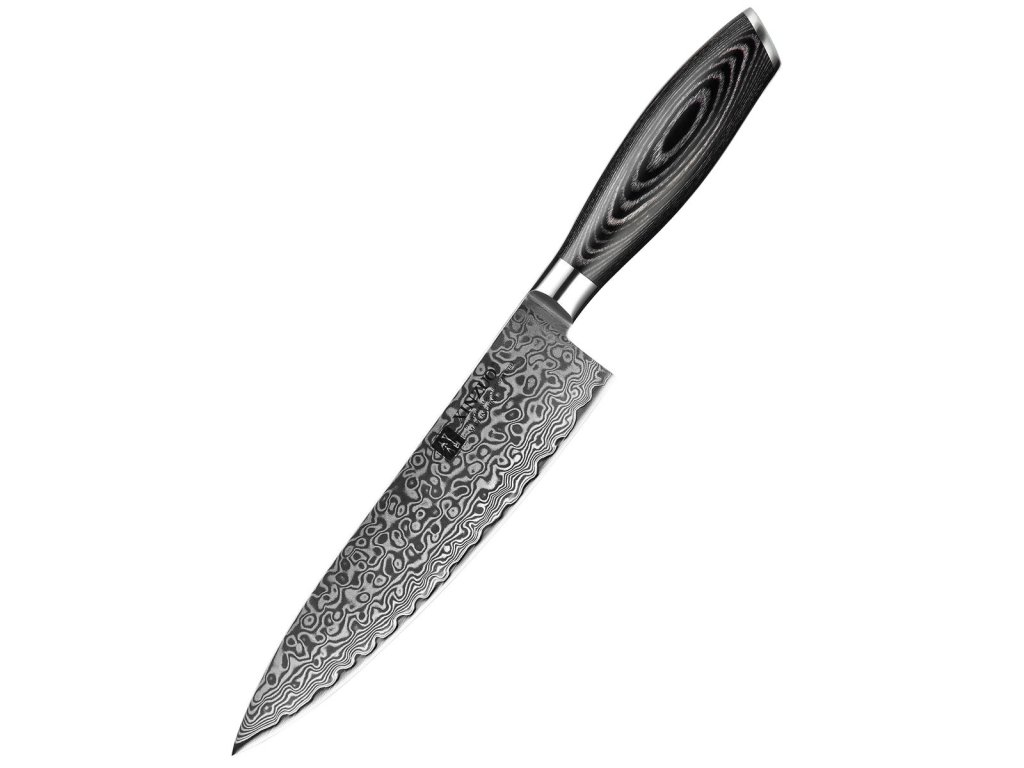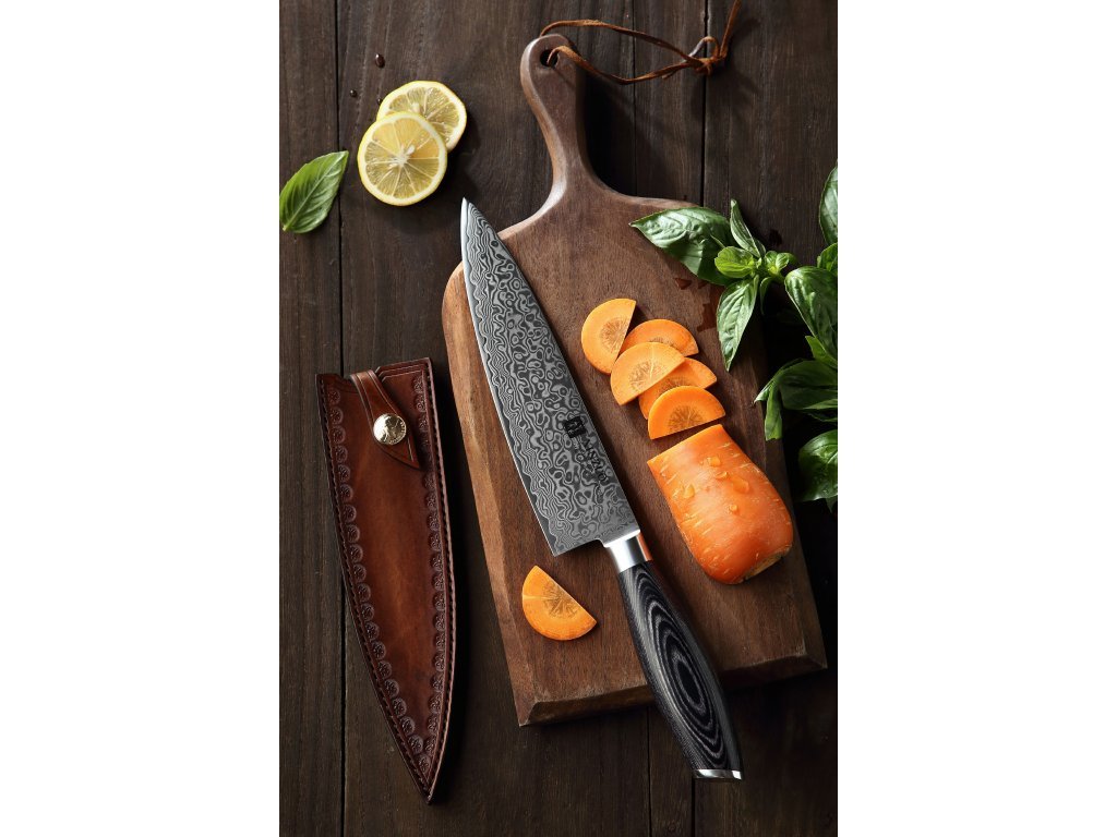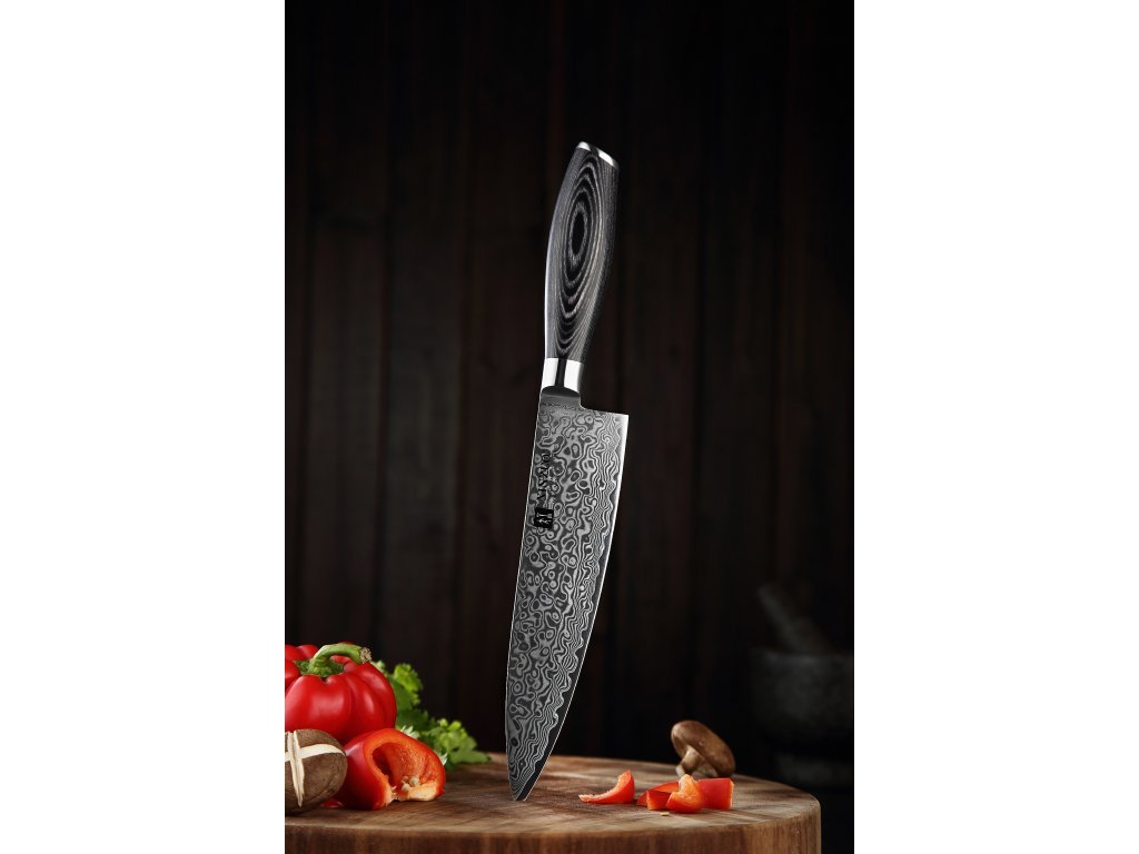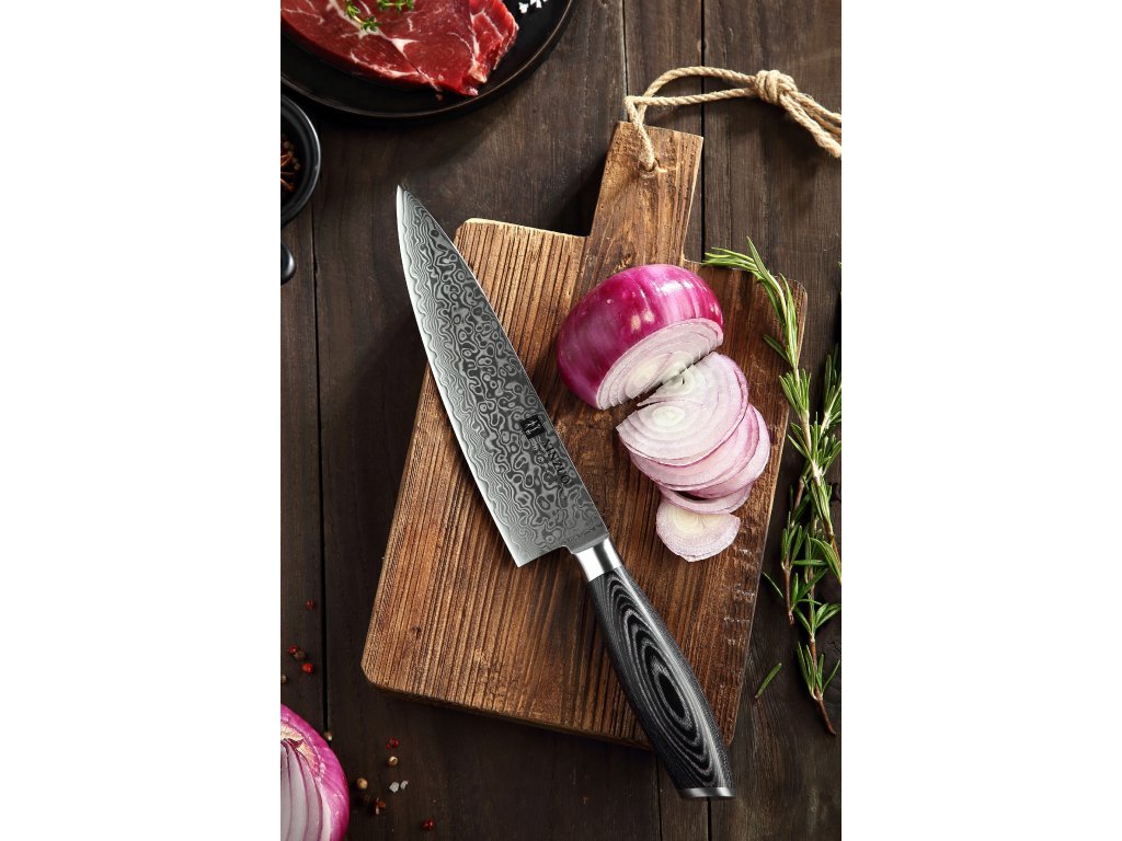 Dieses Chefmesser ist aus hochwertigem Damaszener Stahl gefertigt, der für die Herstellung der besten Messer verwendet wird. Die Messerklinge mit einer Härte von 60±2 Rockwell besteht aus 67 Lagen. Hochwertiger Stahl in einer Kombination von traditioneller Herstellung garantiert eine lange Lebensdauer des Messers. Die Oberfläche des Messers bietet beim Schneiden Komfort, ohne dass es reibt oder dass die Zutaten an die Klinge pappen. Der Griff des Messers ist aus Pakkaholz gefertigt, das aus den Wüstenregionen Nordamerikas gewonnen wird. Es zeichnet sich durch hohe Härte und Stabilität aus. Dank seiner perfekten Form und Länge wird das Schneiden zum Vergnügen und außerdem liegt das Messer gut in der Hand. Aufgrund des natürlichen Griff-Designs kann die Farbe und das Design leicht von den Produktbildern abweichen, da der Griff aus einem anderen Holzstück gefertigt wurde oder da das Alter des Holzes unterschiedlich ist. Der Farbton des Musters auf der Klinge kann unterschiedlich sein, da jedes Messer durch das Stahlschichten einzigartig ist.