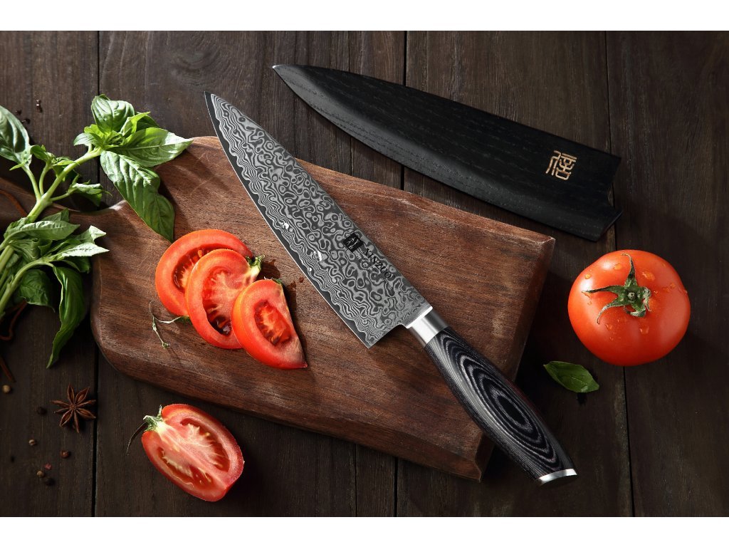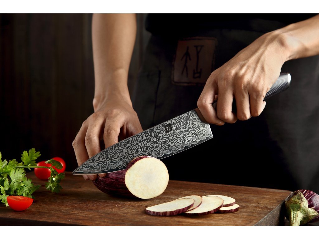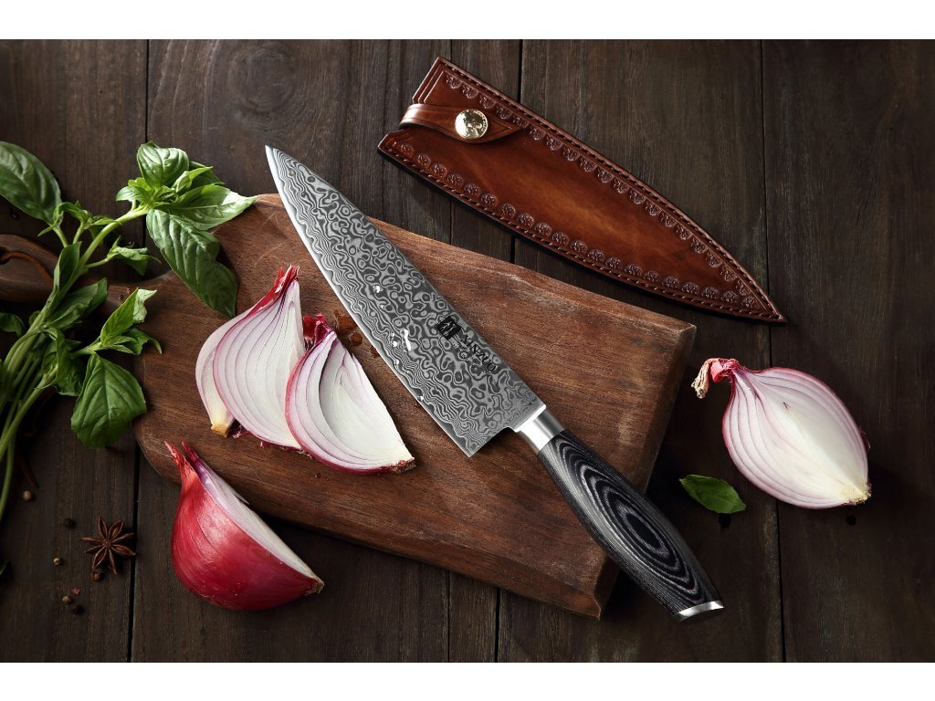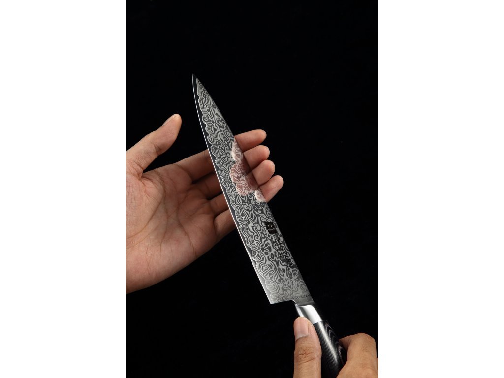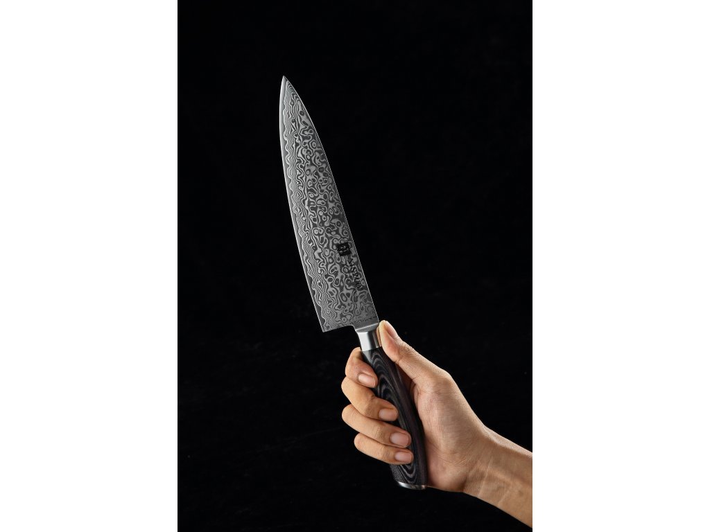 Dieses Chefmesser ist aus hochwertigem Damaszener Stahl gefertigt, der für die Herstellung der besten Messer verwendet wird. Die Messerklinge mit einer Härte von 60±2 Rockwell besteht aus 67 Lagen. Hochwertiger Stahl in einer Kombination von traditioneller Herstellung garantiert eine lange Lebensdauer des Messers. Die Oberfläche des Messers bietet beim Schneiden Komfort, ohne dass es reibt oder dass die Zutaten an die Klinge pappen. Der Griff des Messers ist aus Pakkaholz gefertigt, das aus den Wüstenregionen Nordamerikas gewonnen wird. Es zeichnet sich durch hohe Härte und Stabilität aus. Dank seiner perfekten Form und Länge wird das Schneiden zum Vergnügen und außerdem liegt das Messer gut in der Hand. Aufgrund des natürlichen Griff-Designs kann die Farbe und das Design leicht von den Produktbildern abweichen, da der Griff aus einem anderen Holzstück gefertigt wurde oder da das Alter des Holzes unterschiedlich ist. Der Farbton des Musters auf der Klinge kann unterschiedlich sein, da jedes Messer durch das Stahlschichten einzigartig ist.