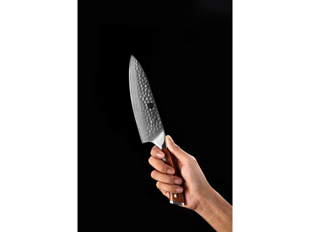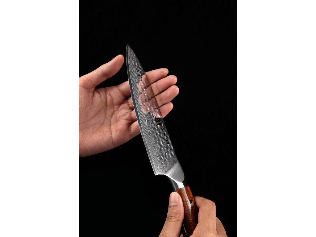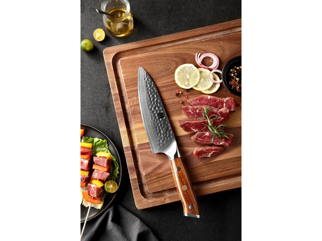 Dieses Chefmesser ist aus hochwertigem Damaszener Stahl gefertigt, der für die Herstellung der besten Messer verwendet wird. Die Messerklinge mit einer Härte von 60±2 Rockwell besteht aus 67 Lagen. Hochwertiger Stahl in einer Kombination von traditioneller Herstellung garantiert eine lange Lebensdauer des Messers. Die Oberfläche des Messers bietet beim Schneiden Komfort, ohne dass es reibt oder dass die Zutaten an die Klinge pappen. Der Griff des Messers ist aus IronWood gefertigt, das aus den Wüstenregionen Nordamerikas gewonnen wird. Es zeichnet sich durch hohe Härte und Stabilität aus. Dank seiner perfekten Form und Länge wird das Schneiden zum Vergnügen und außerdem liegt das Messer gut in der Hand. Aufgrund des natürlichen Griff-Designs kann die Farbe und das Design leicht von den Produktbildern abweichen, da der Griff aus einem anderen Holzstück gefertigt wurde oder da das Alter des Holzes unterschiedlich ist. Der Farbton des Musters auf der Klinge kann unterschiedlich sein, da jedes Messer durch das Stahlschichten einzigartig ist.