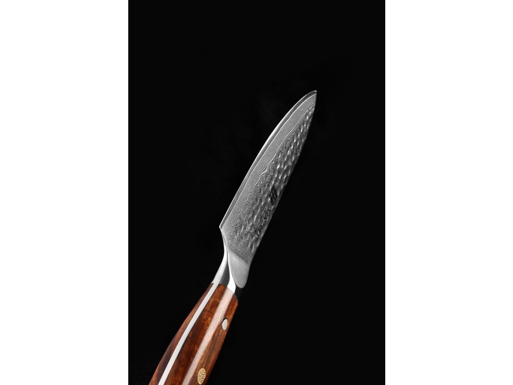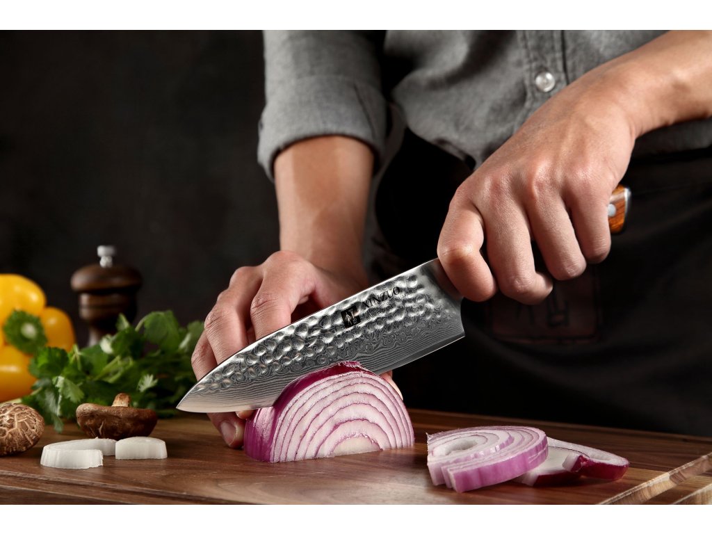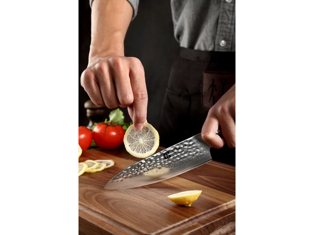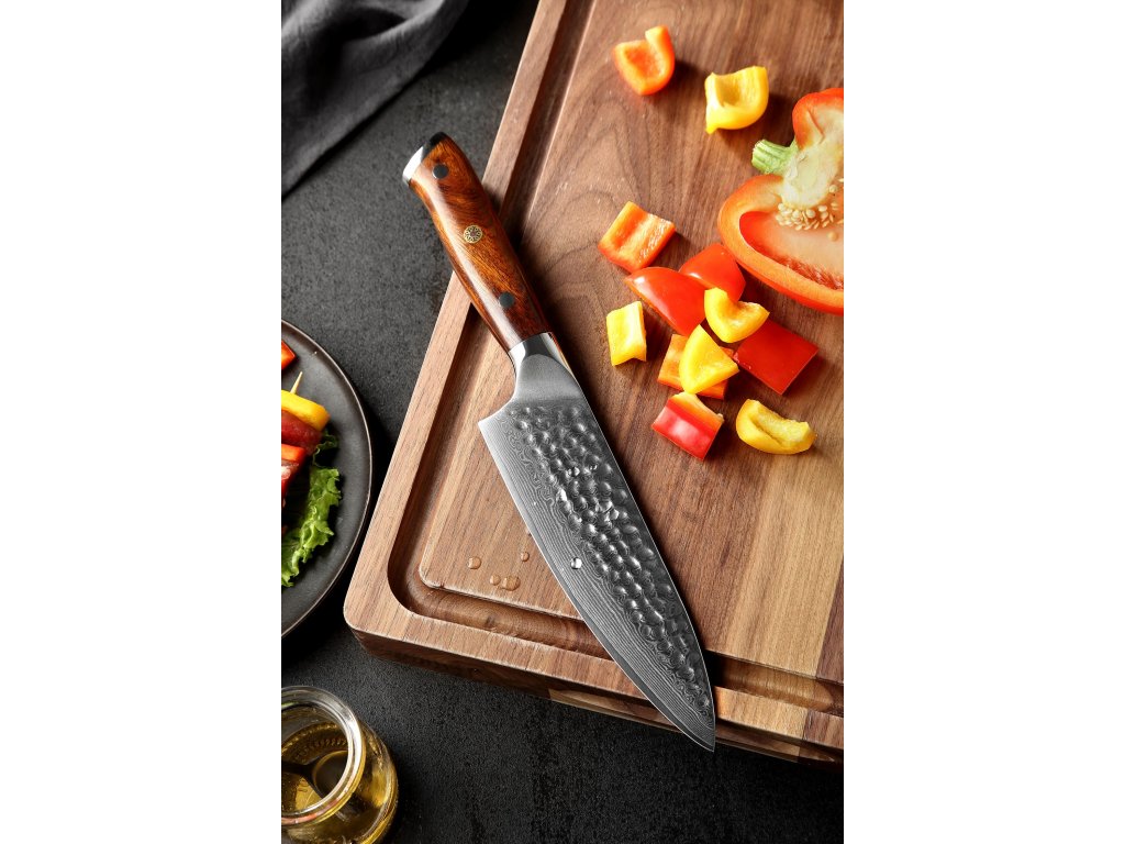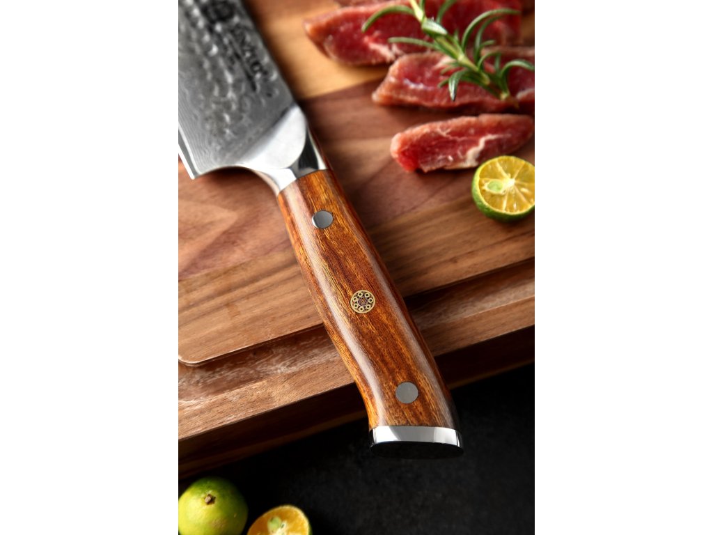 Universales Kochmesser XinZuo Yu B13D, dass sich zum Schneiden der meisten Zutaten eignet. 17 cm-Klingenlänge aus Damaszener Stahl und Eisenholzgriff.