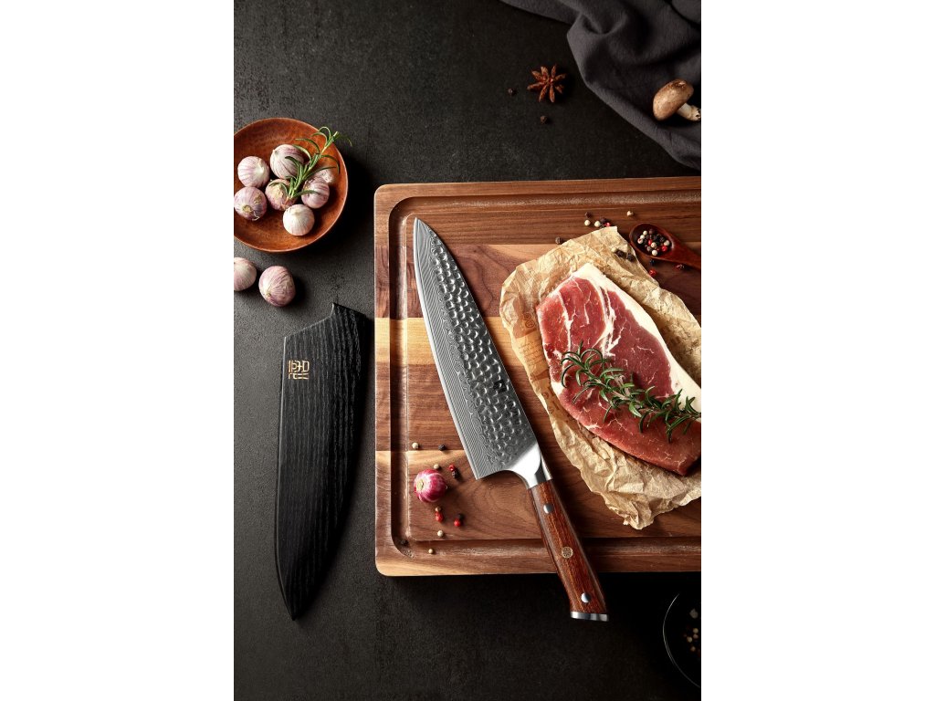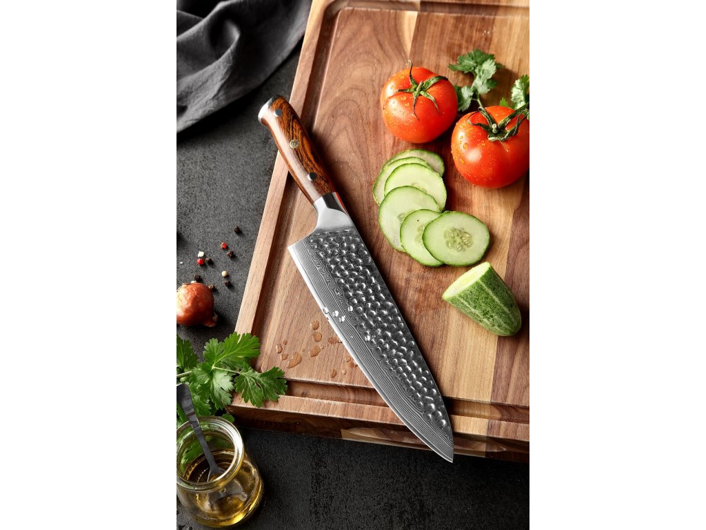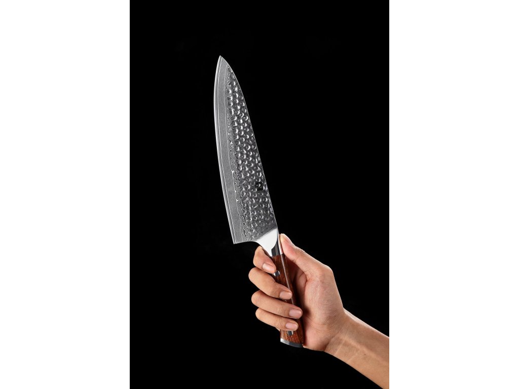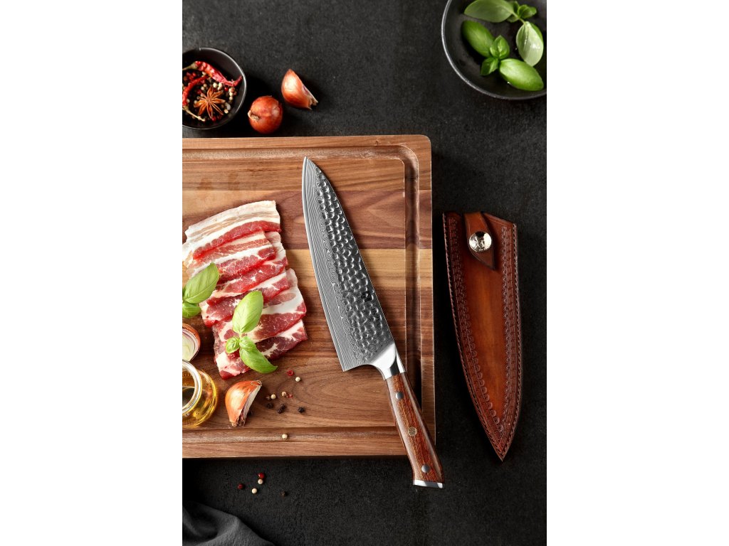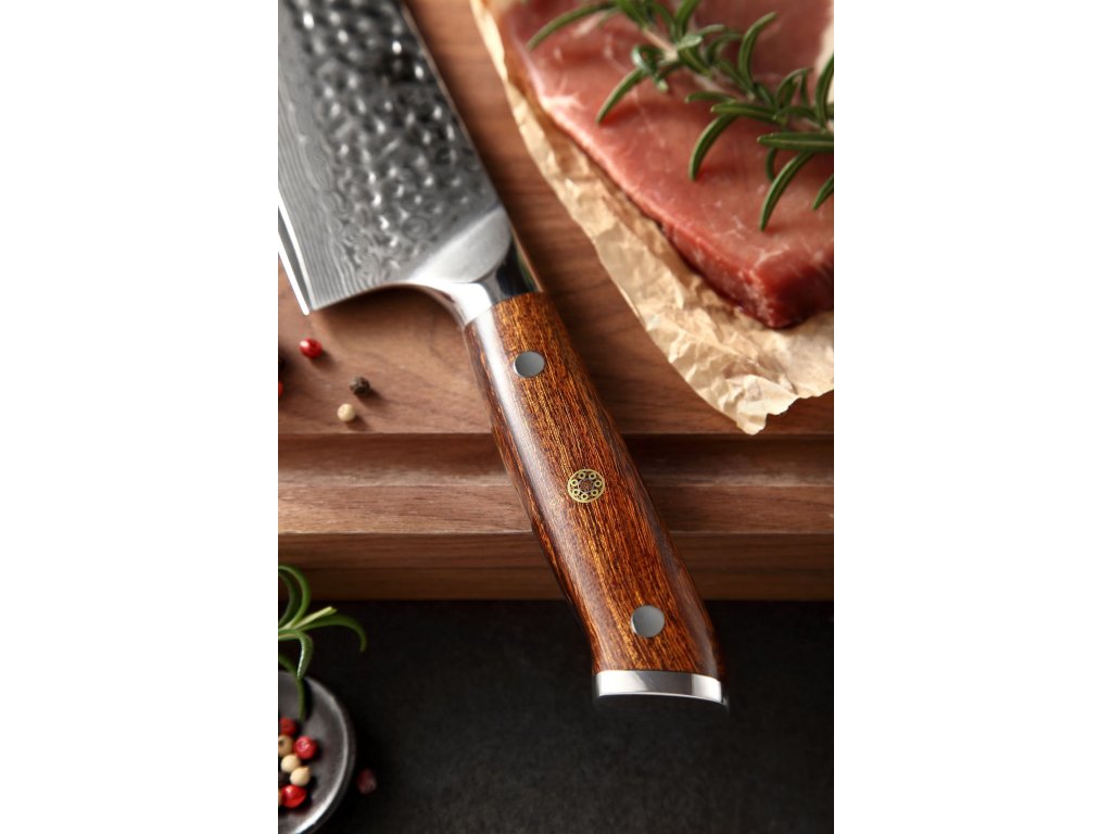 Dieses Chefmesser ist aus hochwertigem Damaszener Stahl gefertigt, der für die Herstellung der besten Messer verwendet wird. Die Messerklinge mit einer Härte von 60±2 Rockwell besteht aus 67 Lagen. Hochwertiger Stahl in einer Kombination von traditioneller Herstellung garantiert eine lange Lebensdauer des Messers. Die Oberfläche des Messers bietet beim Schneiden Komfort, ohne dass es reibt oder dass die Zutaten an die Klinge pappen. Der Griff des Messers ist aus IronWood gefertigt, das aus den Wüstenregionen Nordamerikas gewonnen wird. Es zeichnet sich durch hohe Härte und Stabilität aus. Dank seiner perfekten Form und Länge wird das Schneiden zum Vergnügen und außerdem liegt das Messer gut in der Hand. Aufgrund des natürlichen Griff-Designs kann die Farbe und das Design leicht von den Produktbildern abweichen, da der Griff aus einem anderen Holzstück gefertigt wurde oder da das Alter des Holzes unterschiedlich ist. Der Farbton des Musters auf der Klinge kann unterschiedlich sein, da jedes Messer durch das Stahlschichten einzigartig ist.