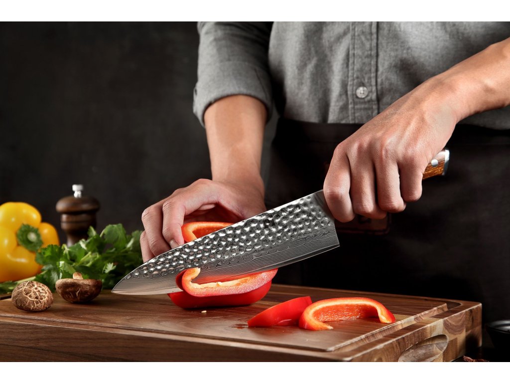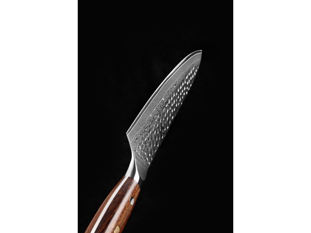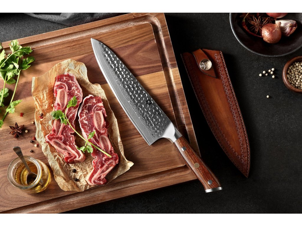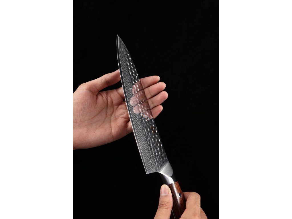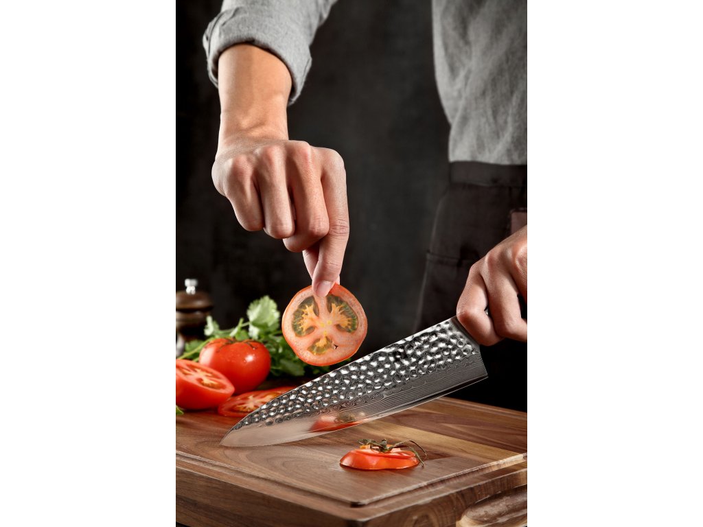 Dieses Chefmesser ist aus hochwertigem Damaszener Stahl gefertigt, der für die Herstellung der besten Messer verwendet wird. Die Messerklinge mit einer Härte von 60±2 Rockwell besteht aus 67 Lagen. Hochwertiger Stahl in einer Kombination von traditioneller Herstellung garantiert eine lange Lebensdauer des Messers. Die Oberfläche des Messers bietet beim Schneiden Komfort, ohne dass es reibt oder dass die Zutaten an die Klinge pappen. Der Griff des Messers ist aus IronWood gefertigt, das aus den Wüstenregionen Nordamerikas gewonnen wird. Es zeichnet sich durch hohe Härte und Stabilität aus. Dank seiner perfekten Form und Länge wird das Schneiden zum Vergnügen und außerdem liegt das Messer gut in der Hand. Aufgrund des natürlichen Griff-Designs kann die Farbe und das Design leicht von den Produktbildern abweichen, da der Griff aus einem anderen Holzstück gefertigt wurde oder da das Alter des Holzes unterschiedlich ist. Der Farbton des Musters auf der Klinge kann unterschiedlich sein, da jedes Messer durch das Stahlschichten einzigartig ist.