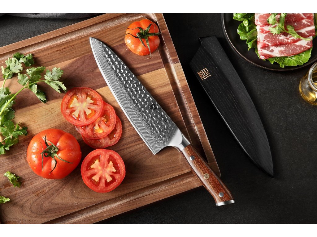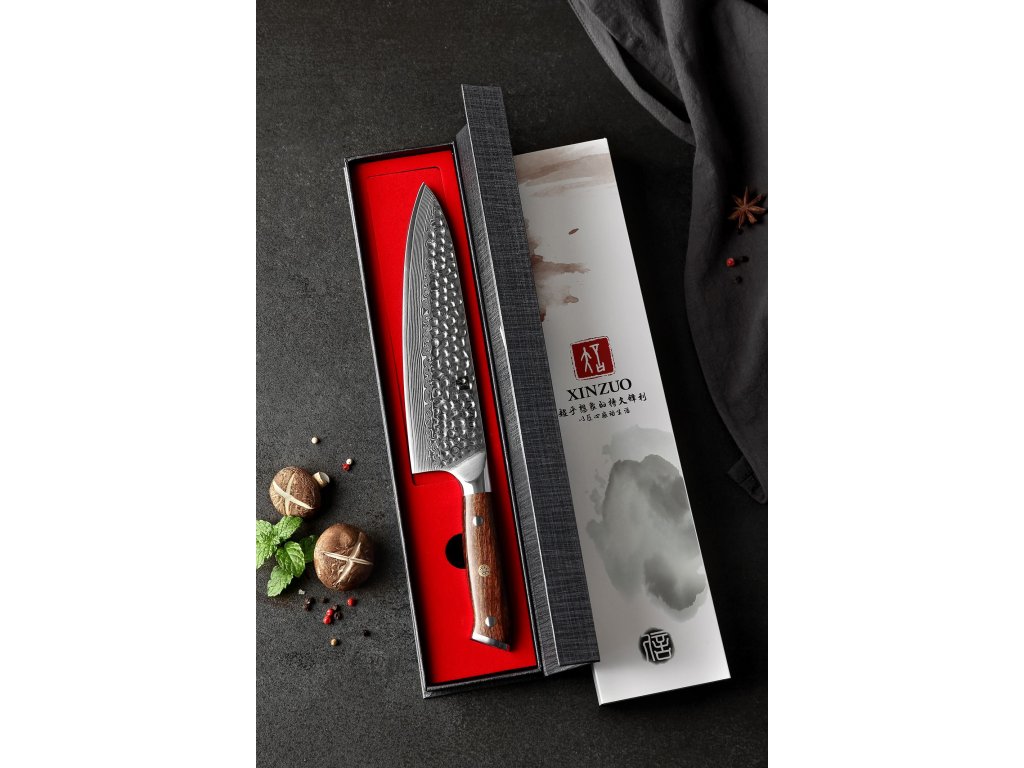 Universales Kochmesser XinZuo Yu B13D, dass sich zum Schneiden der meisten Zutaten eignet. 21 cm-Klingenlänge aus Damaszener Stahl und Eisenholzgriff.