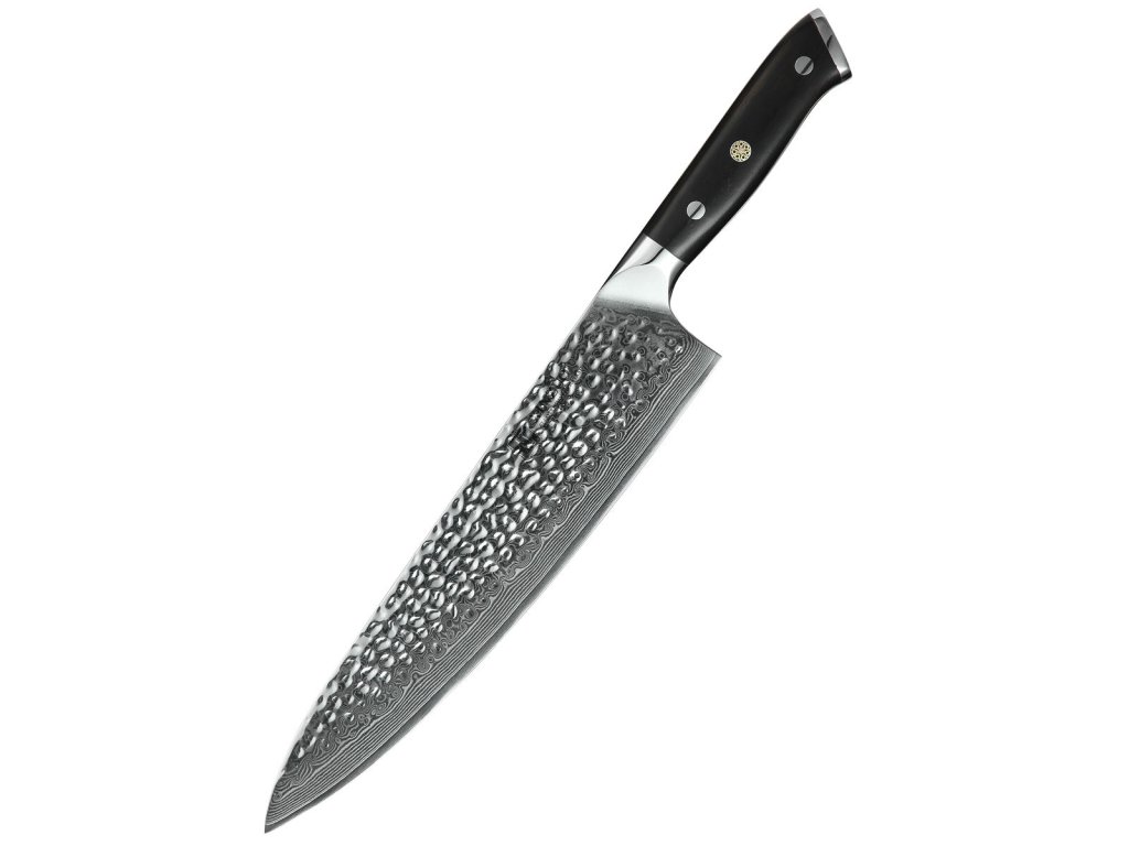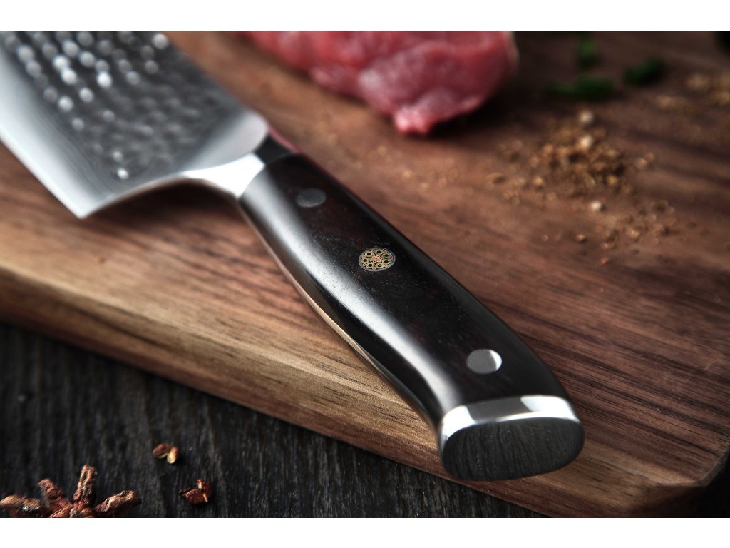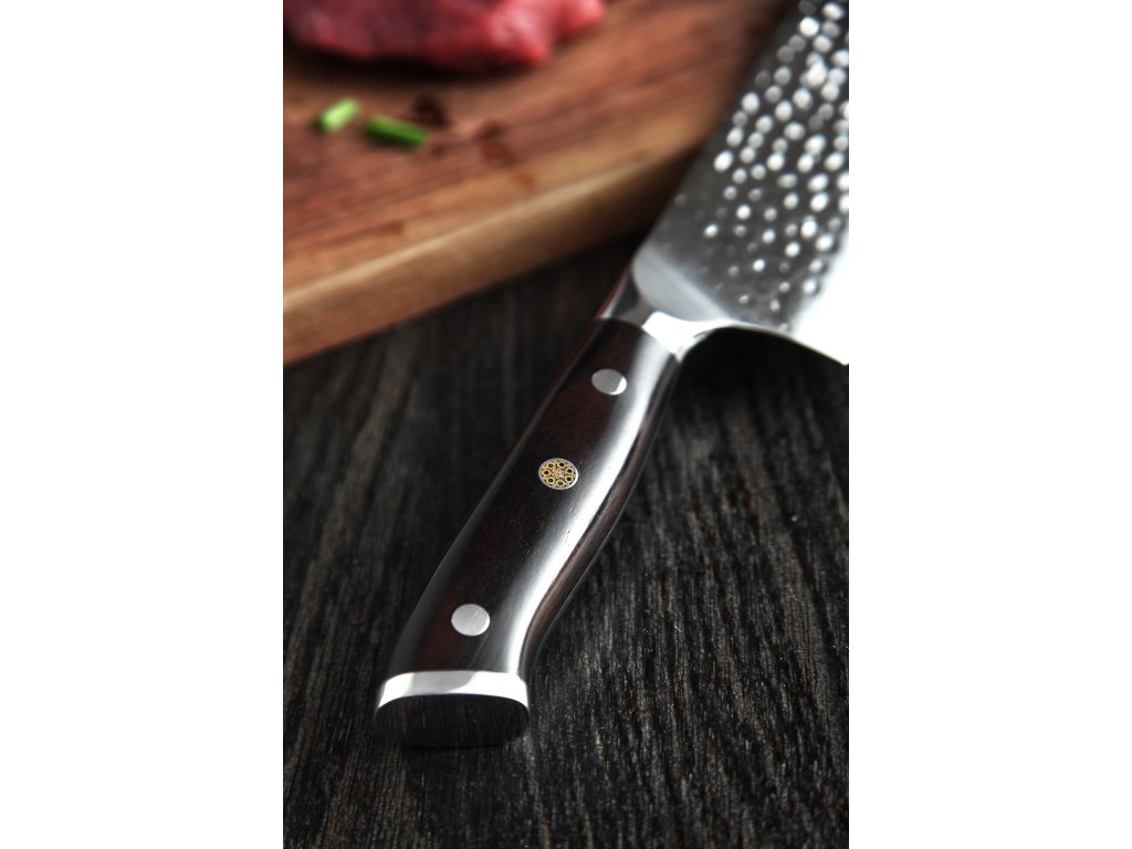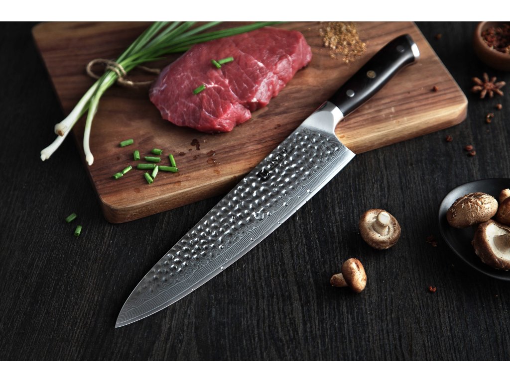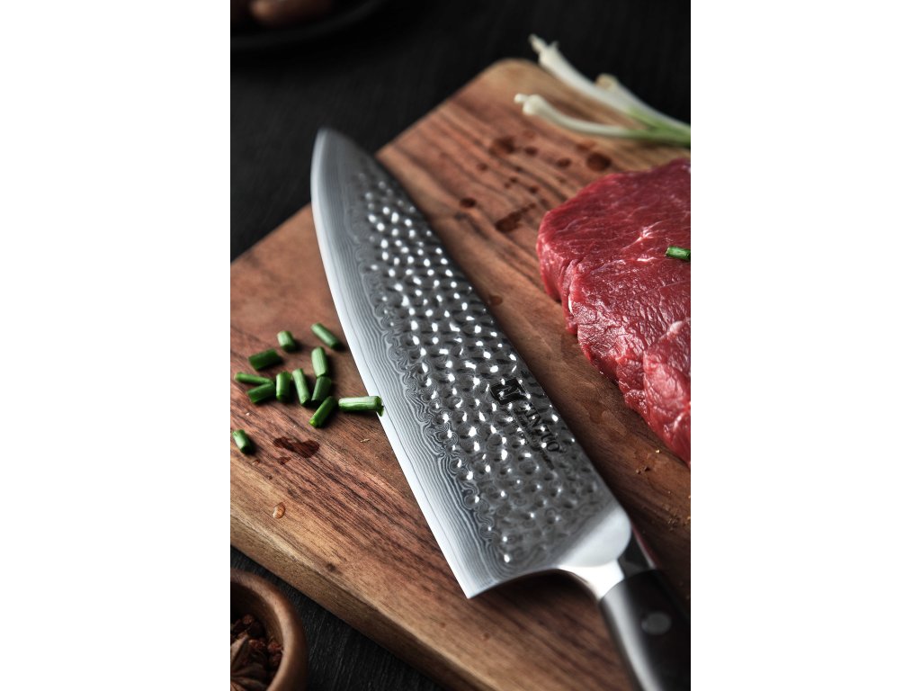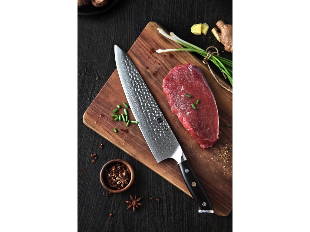 Dieses Chefmesser ist aus hochwertigem Damaszener Stahl gefertigt, der für die Herstellung der besten Messer verwendet wird. Die Messerklinge mit einer Härte von 60±2 Rockwell besteht aus 67 Lagen. Hochwertiger Stahl in einer Kombination von traditioneller Herstellung garantiert eine lange Lebensdauer des Messers. Die Oberfläche des Messers bietet beim Schneiden Komfort, ohne dass es reibt oder dass die Zutaten an die Klinge pappen. Der Griff des Messers ist aus Ebenholz gefertigt, das mit der Zeit weder weicher wird noch einen Geruch annimmt. Dank seiner perfekten Form und Länge wird das Schneiden zum Vergnügen und außerdem liegt das Messer gut in der Hand. Aufgrund des natürlichen Griff-Designs kann die Farbe und das Design leicht von den Produktbildern abweichen, da der Griff aus einem anderen Holzstück gefertigt wurde oder da das Alter des Holzes unterschiedlich ist. Der Farbton des Musters auf der Klinge kann unterschiedlich sein, da jedes Messer durch das Stahlschichten einzigartig ist.
