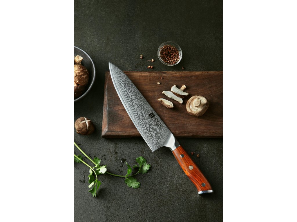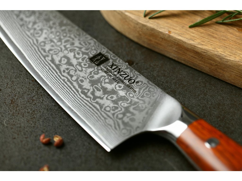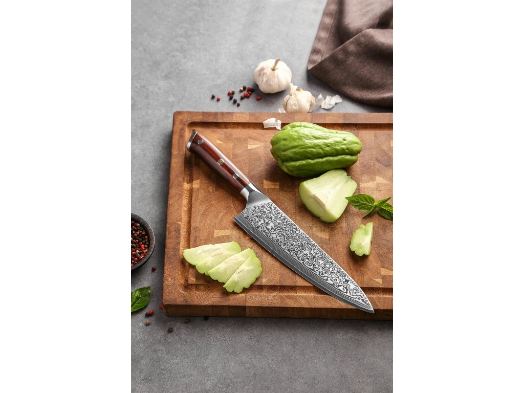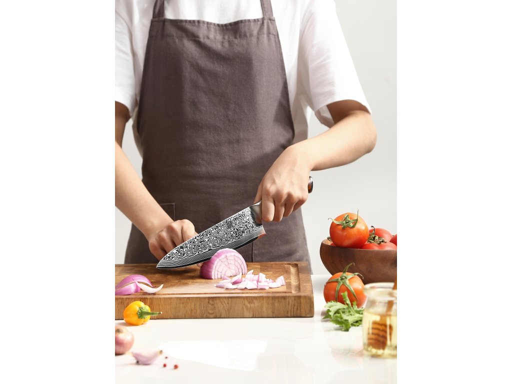 Dieses Chefmesser ist aus hochwertigem Damaszener Stahl gefertigt, der für die Herstellung der besten Messer verwendet wird. Die Messerklinge mit einer Härte von 60±2 Rockwell besteht aus 67 Lagen. Hochwertiger Stahl in einer Kombination von traditioneller Herstellung garantiert eine lange Lebensdauer des Messers. Die Oberfläche des Messers bietet beim Schneiden Komfort, ohne dass es reibt oder dass die Zutaten an die Klinge pappen. Der Griff des Messers ist aus Palisanderholz gefertigt, das mit der Zeit weder weicher wird noch einen Geruch annimmt. Dank seiner perfekten Form und Länge wird das Schneiden zum Vergnügen und außerdem liegt das Messer gut in der Hand. Aufgrund des natürlichen Griff-Designs kann die Farbe und das Design leicht von den Produktbildern abweichen, da der Griff aus einem anderen Holzstück gefertigt wurde oder da das Alter des Holzes unterschiedlich ist. Der Farbton des Musters auf der Klinge kann unterschiedlich sein, da jedes Messer durch das Stahlschichten einzigartig ist.
