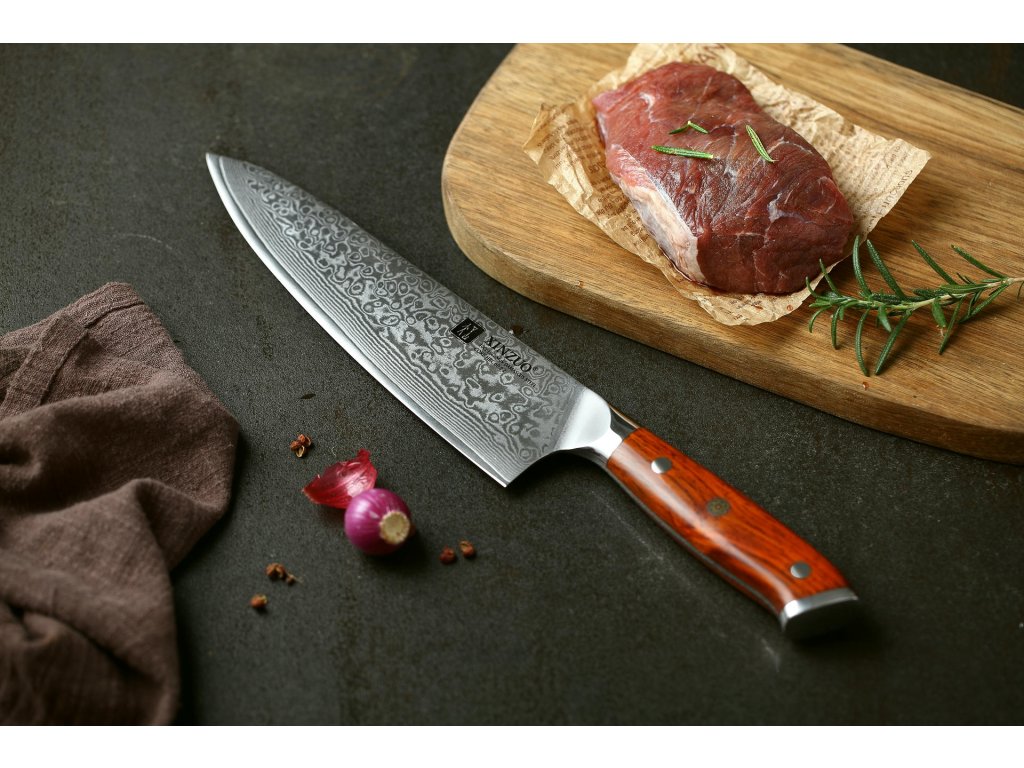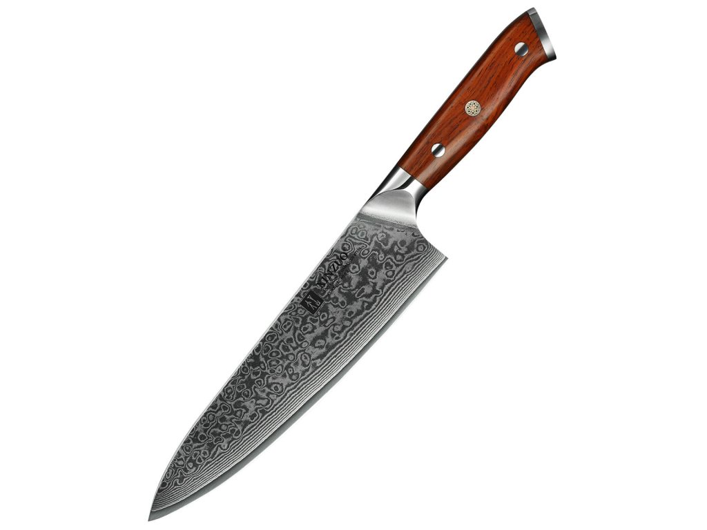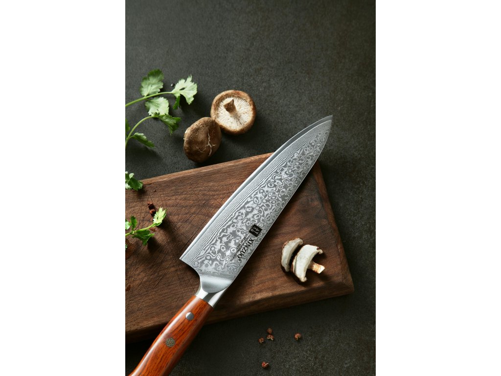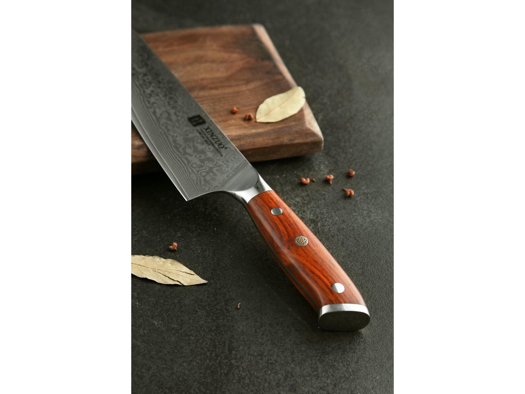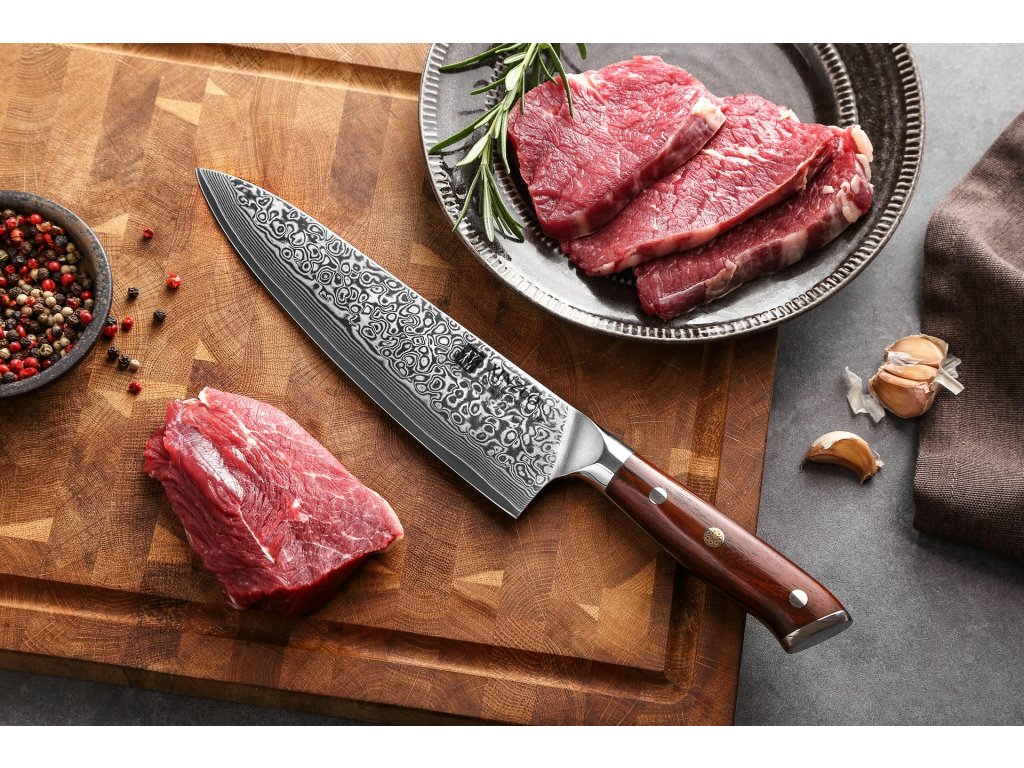 Dieses Chefmesser ist aus hochwertigem Damaszener Stahl gefertigt, der für die Herstellung der besten Messer verwendet wird. Die Messerklinge mit einer Härte von 60±2 Rockwell besteht aus 67 Lagen. Hochwertiger Stahl in einer Kombination von traditioneller Herstellung garantiert eine lange Lebensdauer des Messers. Die Oberfläche des Messers bietet beim Schneiden Komfort, ohne dass es reibt oder dass die Zutaten an die Klinge pappen. Der Griff des Messers ist aus Palisanderholz gefertigt, das mit der Zeit weder weicher wird noch einen Geruch annimmt. Dank seiner perfekten Form und Länge wird das Schneiden zum Vergnügen und außerdem liegt das Messer gut in der Hand. Aufgrund des natürlichen Griff-Designs kann die Farbe und das Design leicht von den Produktbildern abweichen, da der Griff aus einem anderen Holzstück gefertigt wurde oder da das Alter des Holzes unterschiedlich ist. Der Farbton des Musters auf der Klinge kann unterschiedlich sein, da jedes Messer durch das Stahlschichten einzigartig ist.