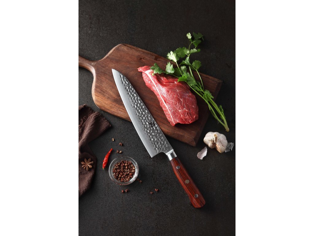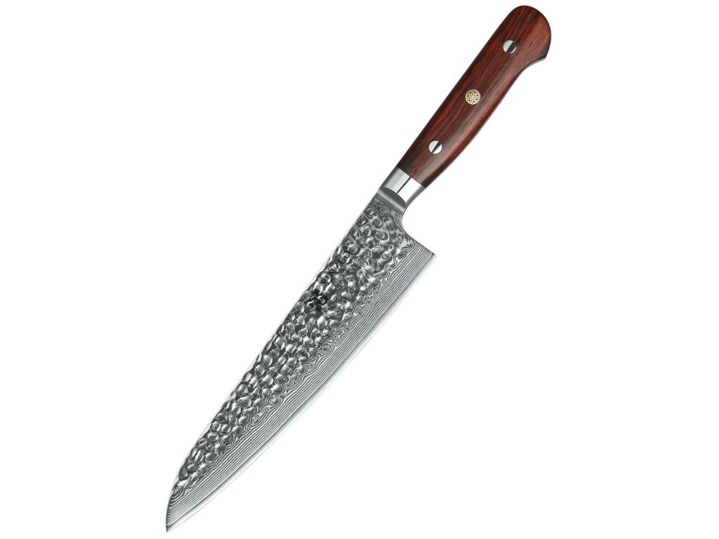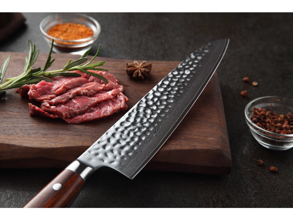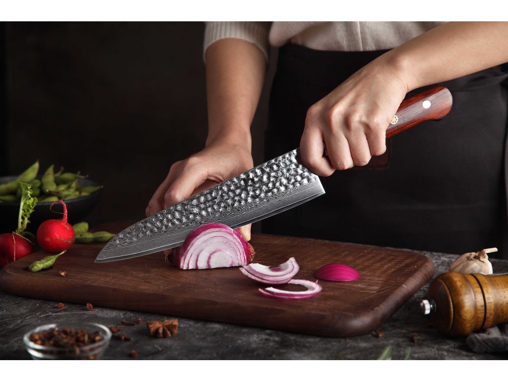 Dieses Chefmesser ist aus hochwertigem Damaszener Stahl gefertigt, der für die Herstellung der besten Messer verwendet wird. Die Messerklinge mit einer Härte von 60±2 Rockwell besteht aus 67 Lagen. Hochwertiger Stahl in einer Kombination von traditioneller Herstellung garantiert eine lange Lebensdauer des Messers. Die Oberfläche des Messers bietet beim Schneiden Komfort, ohne dass es reibt oder dass die Zutaten an die Klinge pappen. Der Messergriff besteht aus Palisanderholz, das mit der Zeit weder weicher wird noch Geruch annimmt. Dank seiner perfekten Form und Länge wird das Schneiden zum Vergnügen und außerdem liegt das Messer gut in der Hand. Aufgrund des natürlichen Griff-Designs kann die Farbe und das Design leicht von den Produktbildern abweichen, da der Griff aus einem anderen Holzstück gefertigt wurde oder da das Alter des Holzes unterschiedlich ist. Der Farbton des Musters auf der Klinge kann unterschiedlich sein, da jedes Messer durch das Stahlschichten einzigartig ist.