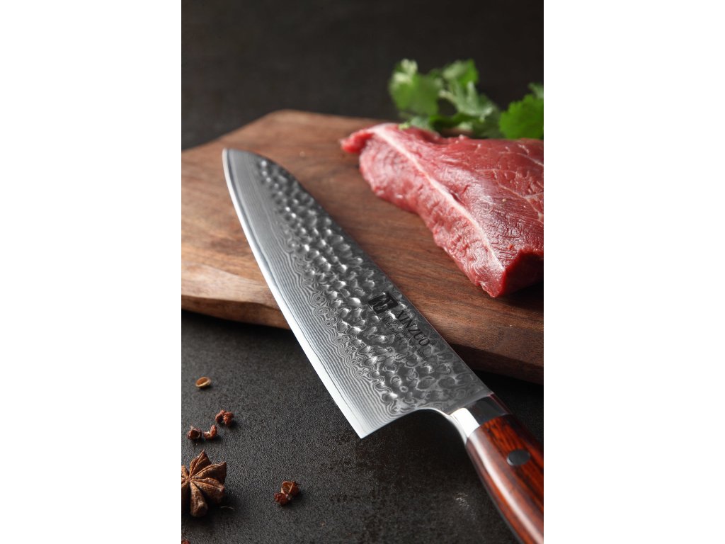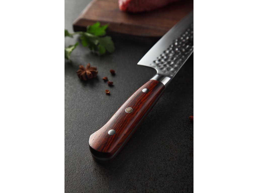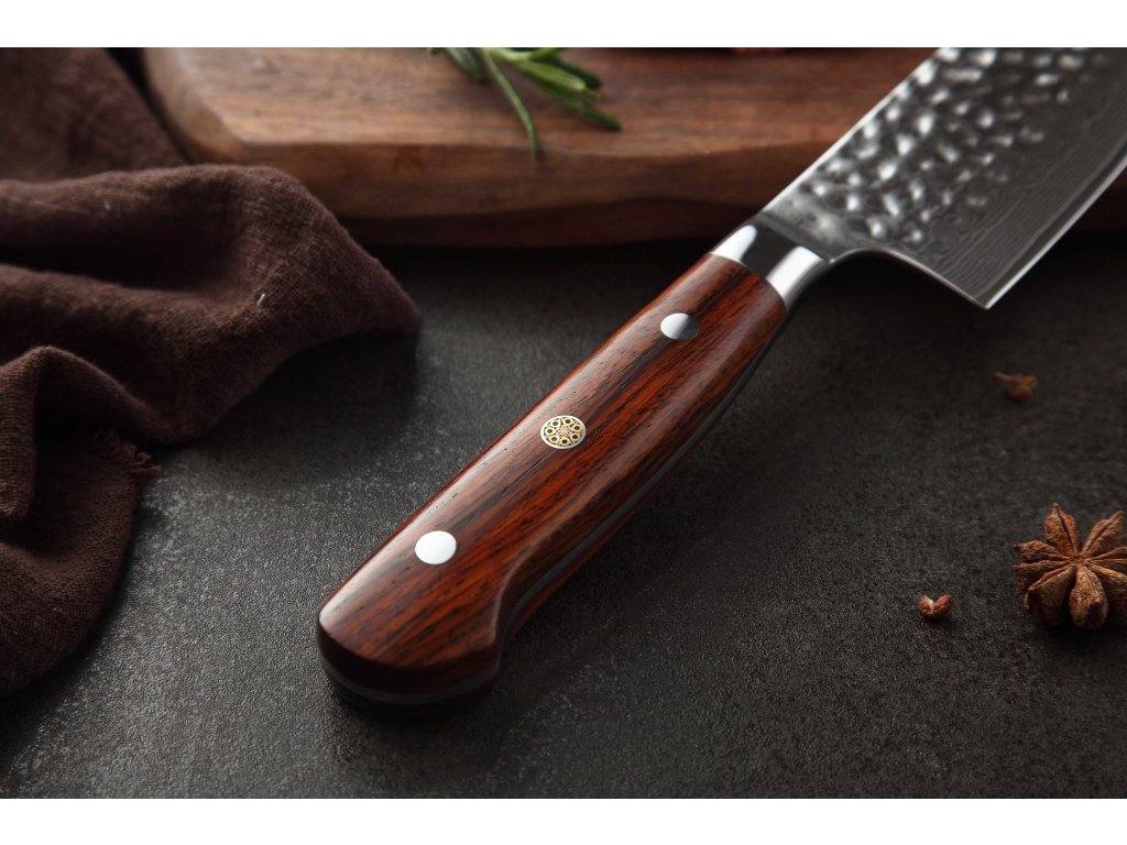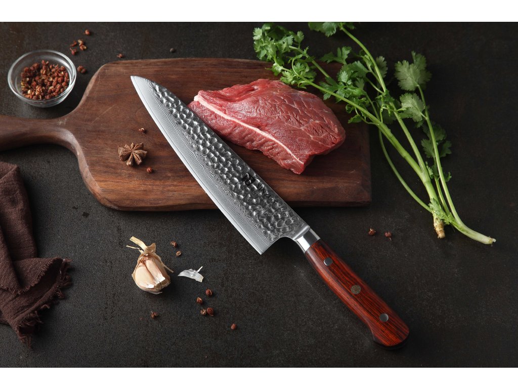 Dieses Chefmesser ist aus hochwertigem Damaszener Stahl gefertigt, der für die Herstellung der besten Messer verwendet wird. Die Messerklinge mit einer Härte von 60±2 Rockwell besteht aus 67 Lagen. Hochwertiger Stahl in einer Kombination von traditioneller Herstellung garantiert eine lange Lebensdauer des Messers. Die Oberfläche des Messers bietet beim Schneiden Komfort, ohne dass es reibt oder dass die Zutaten an die Klinge pappen. Der Messergriff besteht aus Palisanderholz, das mit der Zeit weder weicher wird noch Geruch annimmt. Dank seiner perfekten Form und Länge wird das Schneiden zum Vergnügen und außerdem liegt das Messer gut in der Hand. Aufgrund des natürlichen Griff-Designs kann die Farbe und das Design leicht von den Produktbildern abweichen, da der Griff aus einem anderen Holzstück gefertigt wurde oder da das Alter des Holzes unterschiedlich ist. Der Farbton des Musters auf der Klinge kann unterschiedlich sein, da jedes Messer durch das Stahlschichten einzigartig ist.