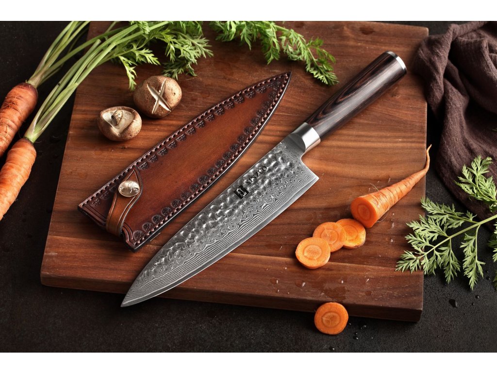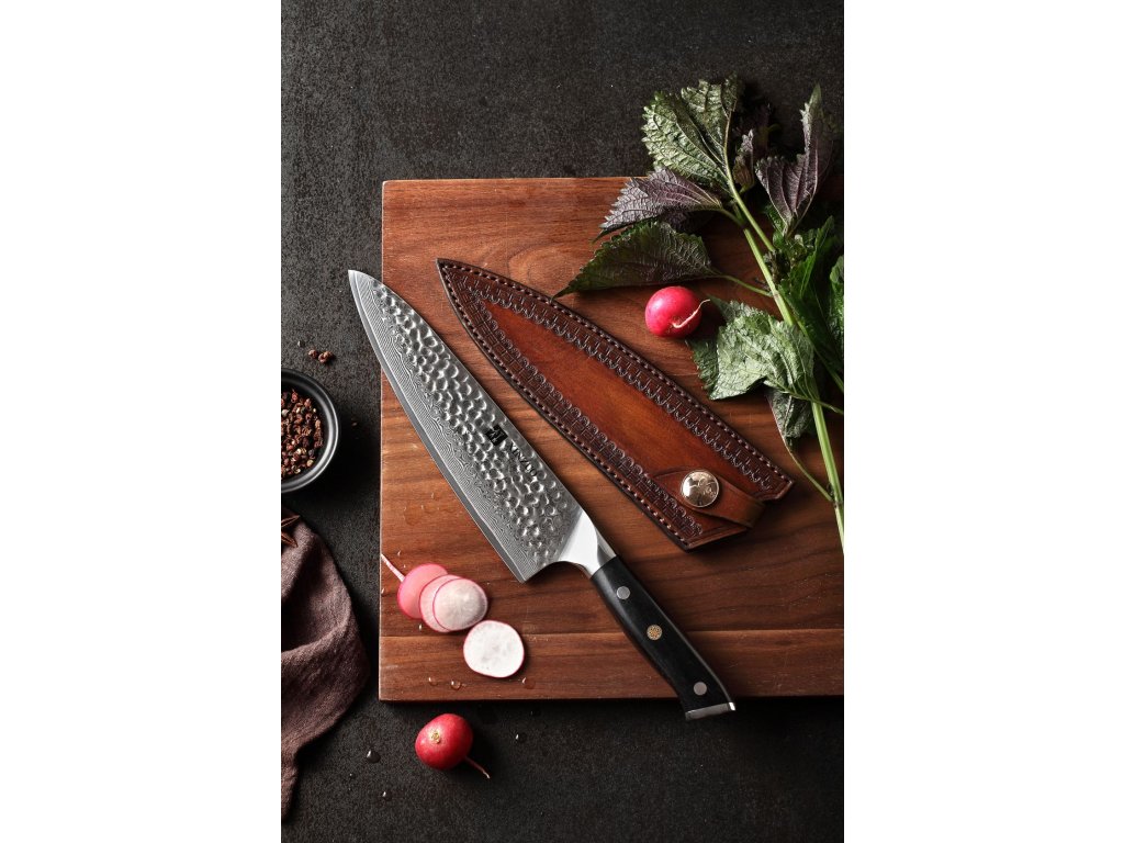 Die Messertasche ist aus echtem Leder hergestellt, und auf jeweilige Kochmesser (aus den unterstützten Messerserien) nach Maß angefertigt, so dass sie perfekt auf dessen Klinge sitzt. Die Tasche ist mit einer praktischen Schlaufe ausgestattet, die verhindert, dass das Messer aus der Messerscheide herausrutscht. Die Schlaufe ist mit einem eleganten Druckknopf versehen, der die edle Optik der gesamten Messerscheide unterstreicht.