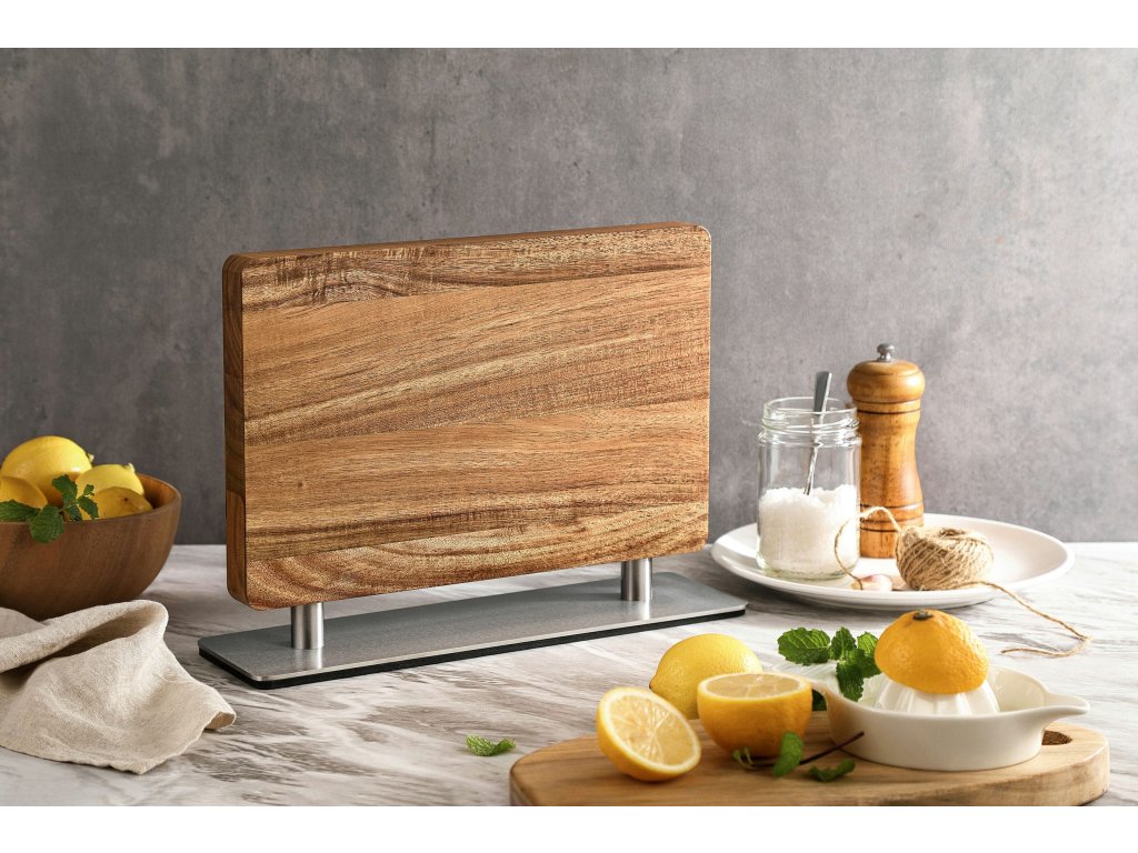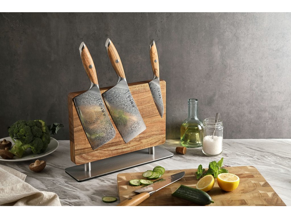 Der obere Teil des Blocks ist aus Akazienholz gefertigt, was auch seinen natürlichen Charakter bewahrt. Im Inneren befinden sich sehr starke Magnete, die die Messer fest an ihrem Platz halten. Der untere Teil der Beine mit dem Sockel ist aus rostfreiem Edelstahl 430 gefertigt.