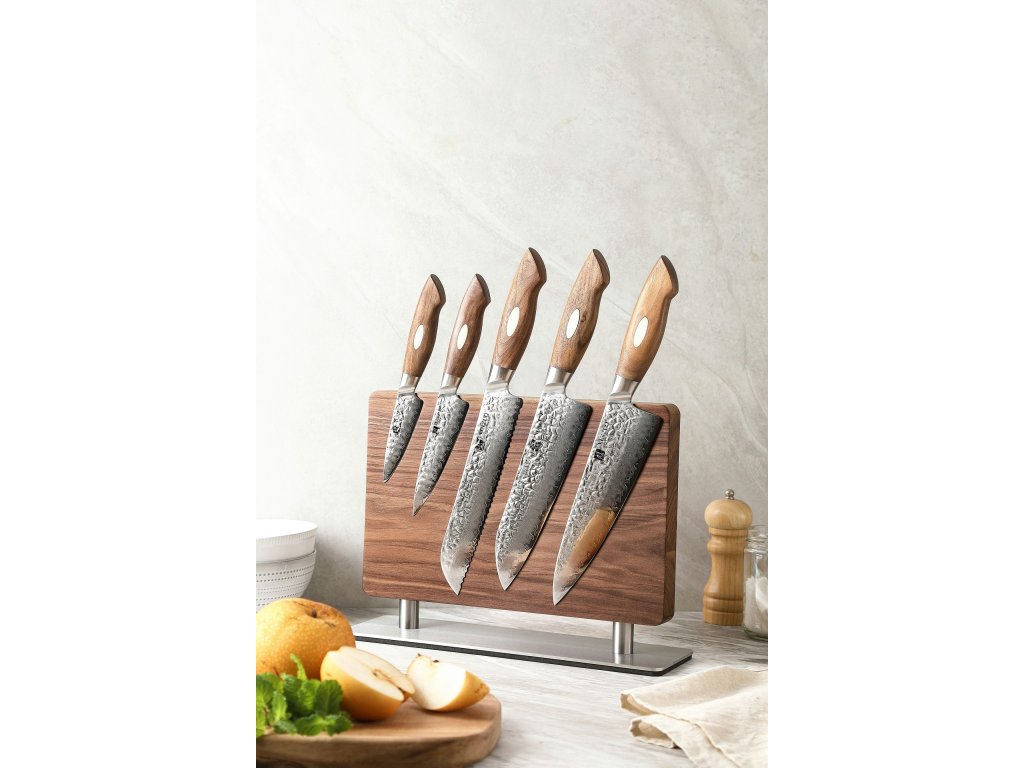 Der obere Teil des Blocks ist aus Wahlnussholz gefertigt, was auch seinen natürlichen Charakter bewahrt. Im Inneren befinden sich sehr starke Magnete, die die Messer fest an ihrem Platz halten. Der untere Teil der Beine mit dem Sockel ist aus Edelstahl 430 gefertigt.