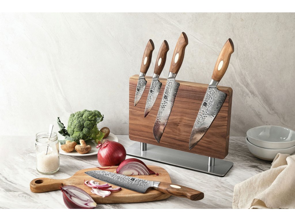Luxuriöser doppelseitiger Magnet-Messerblock aus Walnussholz und Edelstahl für bis zu 10 Küchenmesser.