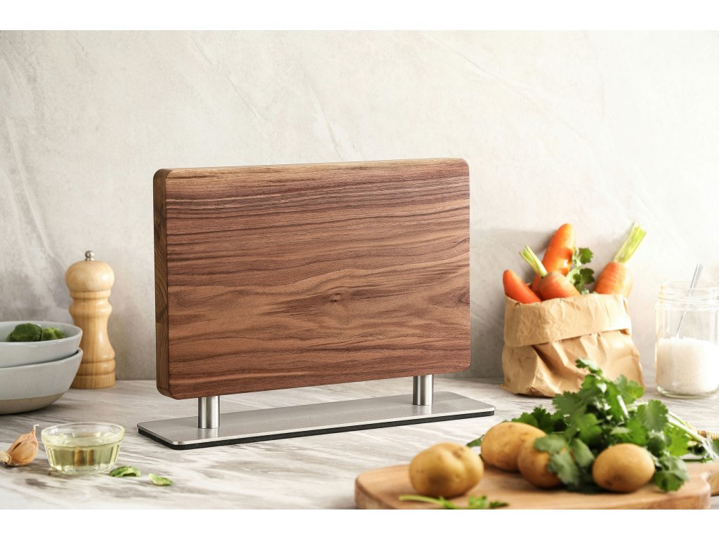 Ein eleganter Magnet-Messerblock, der die Schönheit von Holz mit der Stabilität von Stahl verbindet. Die Küchenmesser können von beiden Seiten auf die Fläche befestigt werden und halten dank der starken Magnete im Inneren des Holzes fest. Sein ausgeklügelter Stahlsockel verleiht dem Messerblock einen hohe Stabilität, also Sie müssen sich keine Sorgen machen, dass er leicht umkippt.