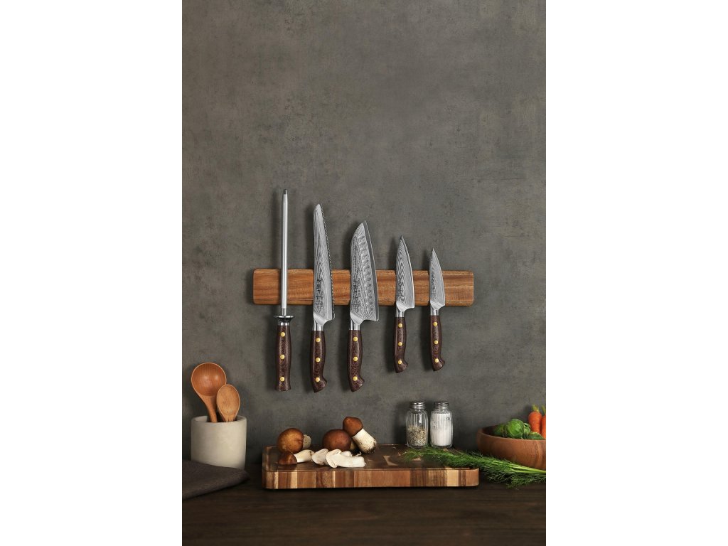 Die Größe der Leiste ist so ausgelegt, dass sie bis zu sechs Messer oder Zubehör (z. B. einen Wetzstahl) problemlos tragen kann. Die Außenseite besteht aus natürlichem Akazienholz mit einem hellen Farbton. Farbe und Aussehen der Leiste können leicht von den Produktbildern abweichen, da jede aus einem anderen Stück Akazienholz gefertigt wird und das Holz unterschiedliches Alter haben kann. Im Inneren der Leiste befinden sich zwei Reihen runder, starker Magnete (die einen festen Halt für Küchenmesser gewährleisten.). Die Magnetleiste hat ein Gewicht von 500 g.