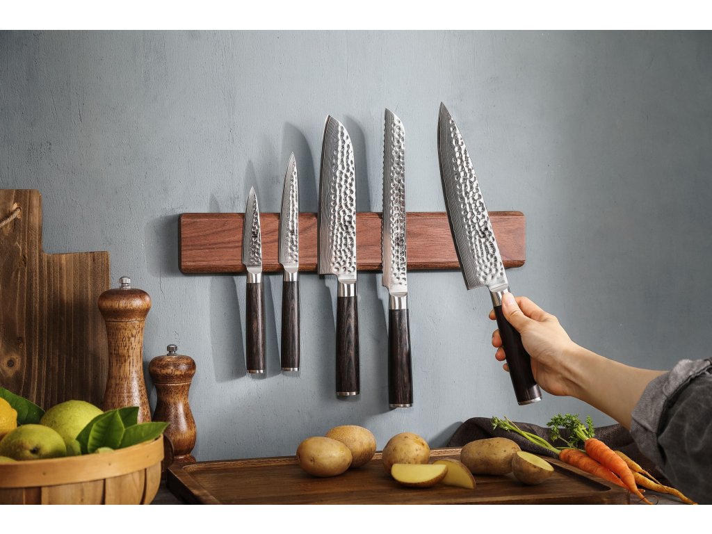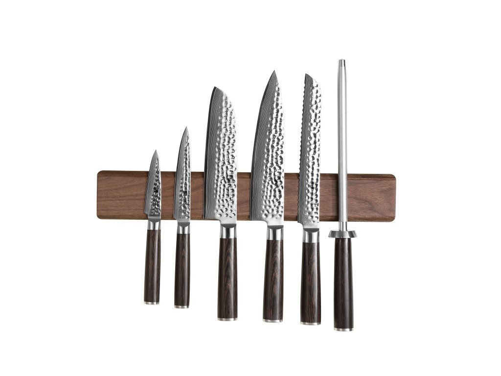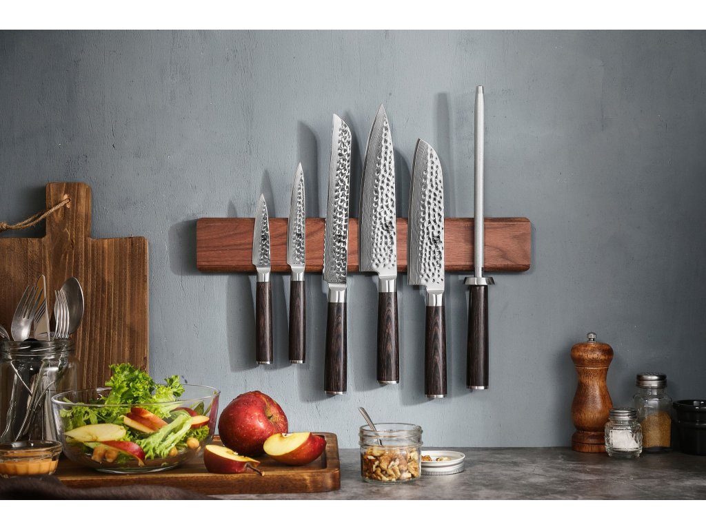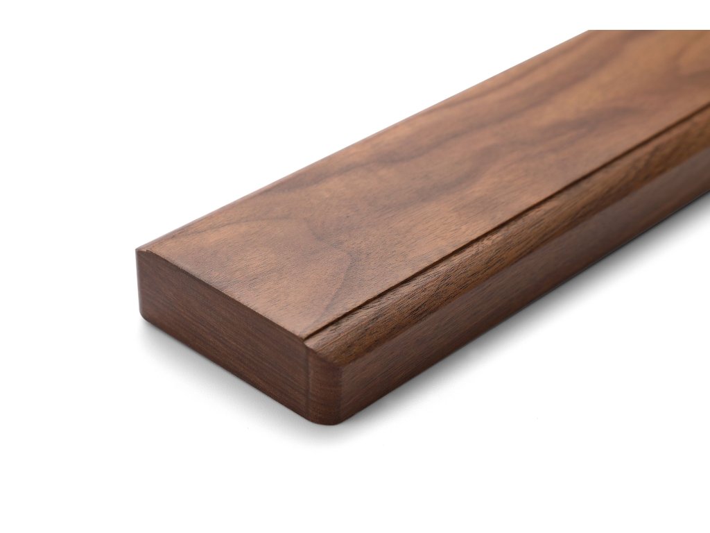 Eine elegante Messerleiste aus natürlichem Walnussholz, in der sich starke Magnete verbergen. Dank hochwertiger Magnete halten die Messer an der Leiste, als wären sie daran festgenagelt. Das Walnussholz verleiht der Leiste ein einzigartiges natürliches Design und passt mit seinem dunklen Ton sowohl in dunkle als auch in helle Küchen. In einer dunklen Küche wird sie unauffällig wirken, ohne den Gesamteindruck zu stören, während sie in einer hellen Küche ein auffälliges, kontrastreiches Element darstellen kann, das die Küche noch interessanter macht.