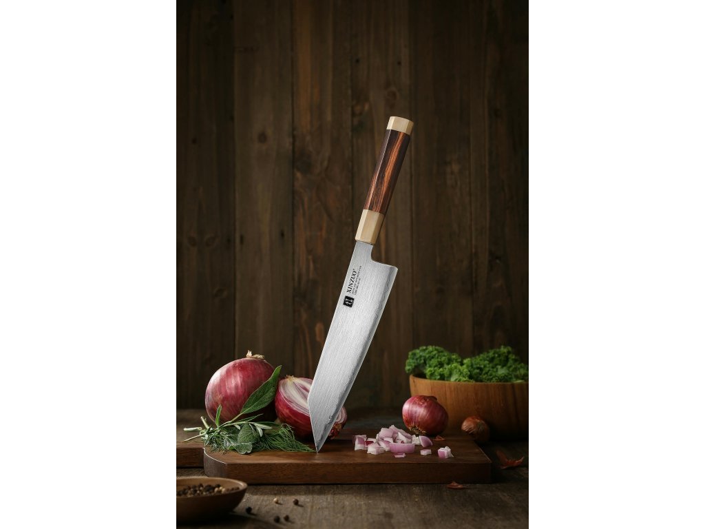 Das luxuriose Messer Bunka XinZuo Zhen X05Z 21 cm mit einer Klinge aus japanischem Stahl und einem traditionellen achteckigen Griff, wird in einer eleganten Holzbox geliefert.