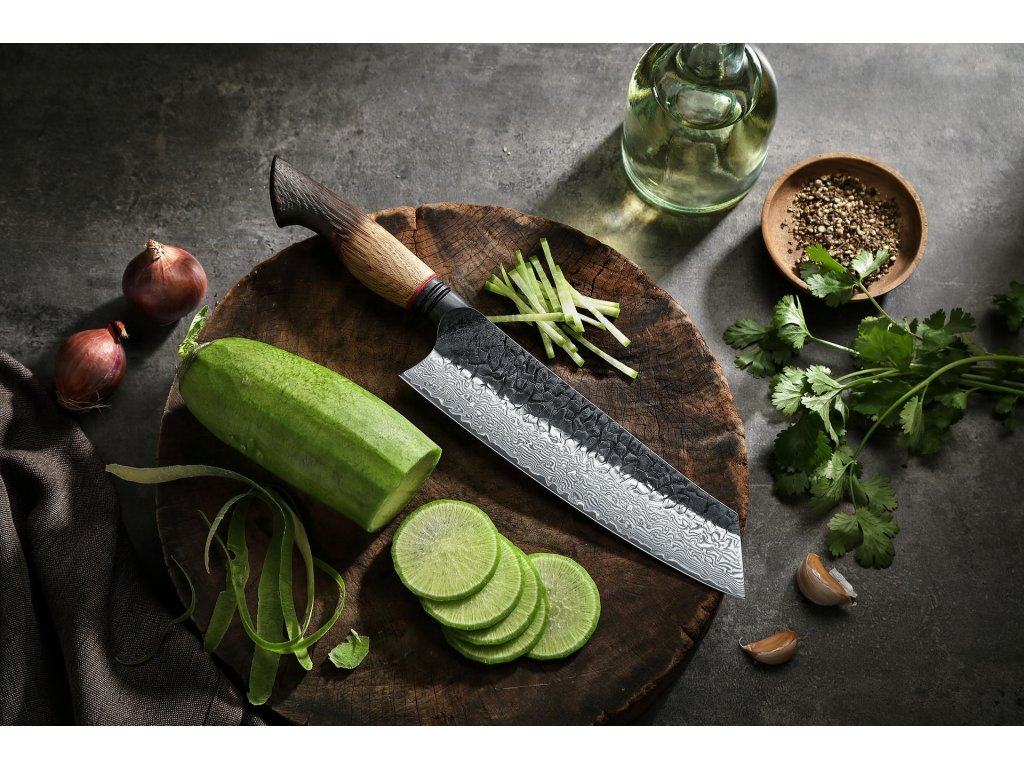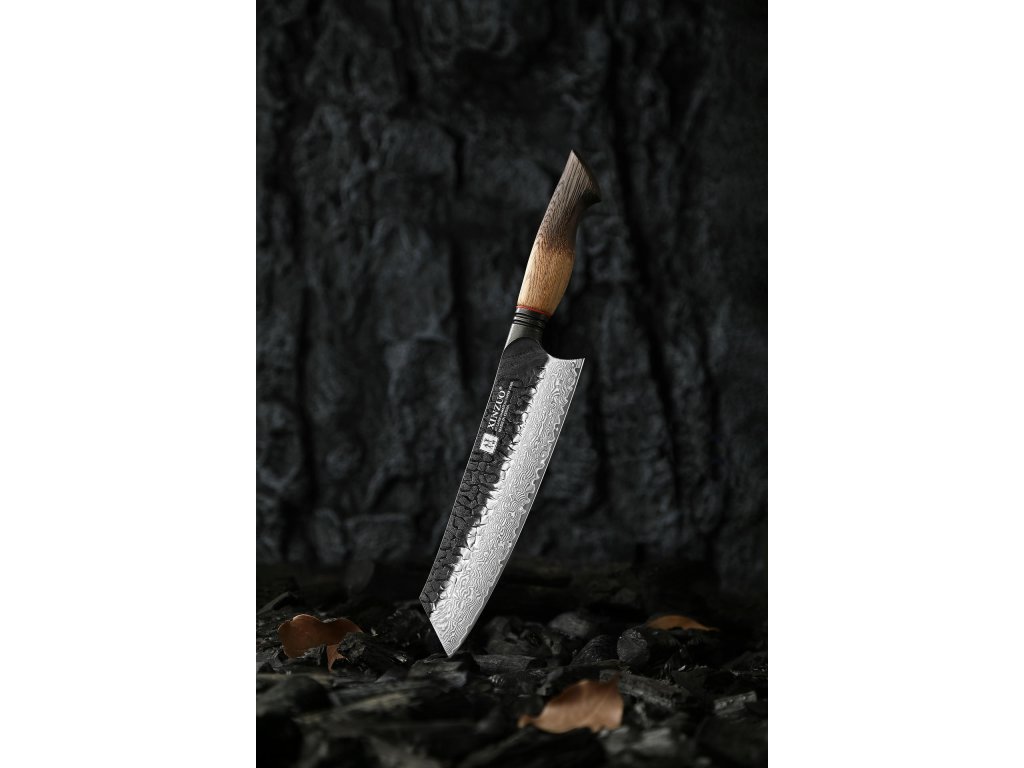 Messer Bunka XinZuo Mo X06 21 cm mit einzigartiger Damastklinge und handgefertigtem Eichenholzgriff, der fließend von einer hellen, warmen Farbe zu einer rauchigen, dunklen übergeht.