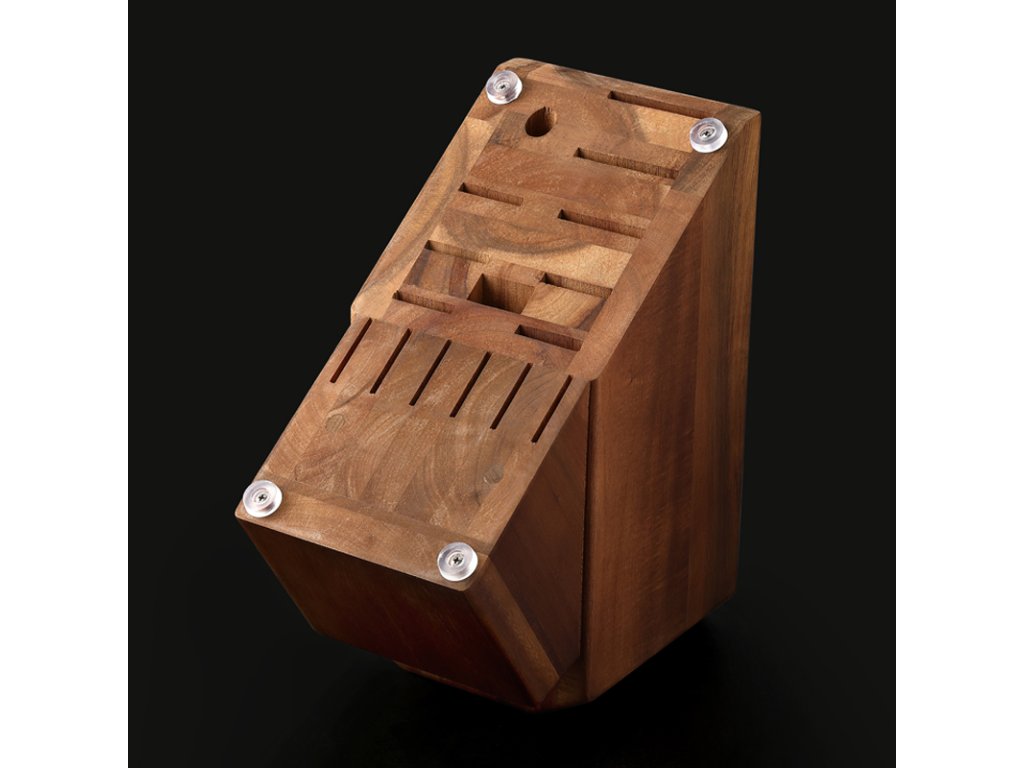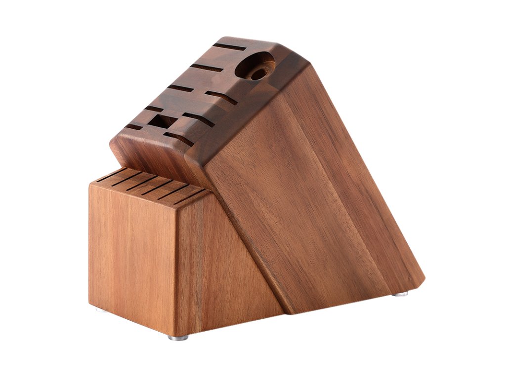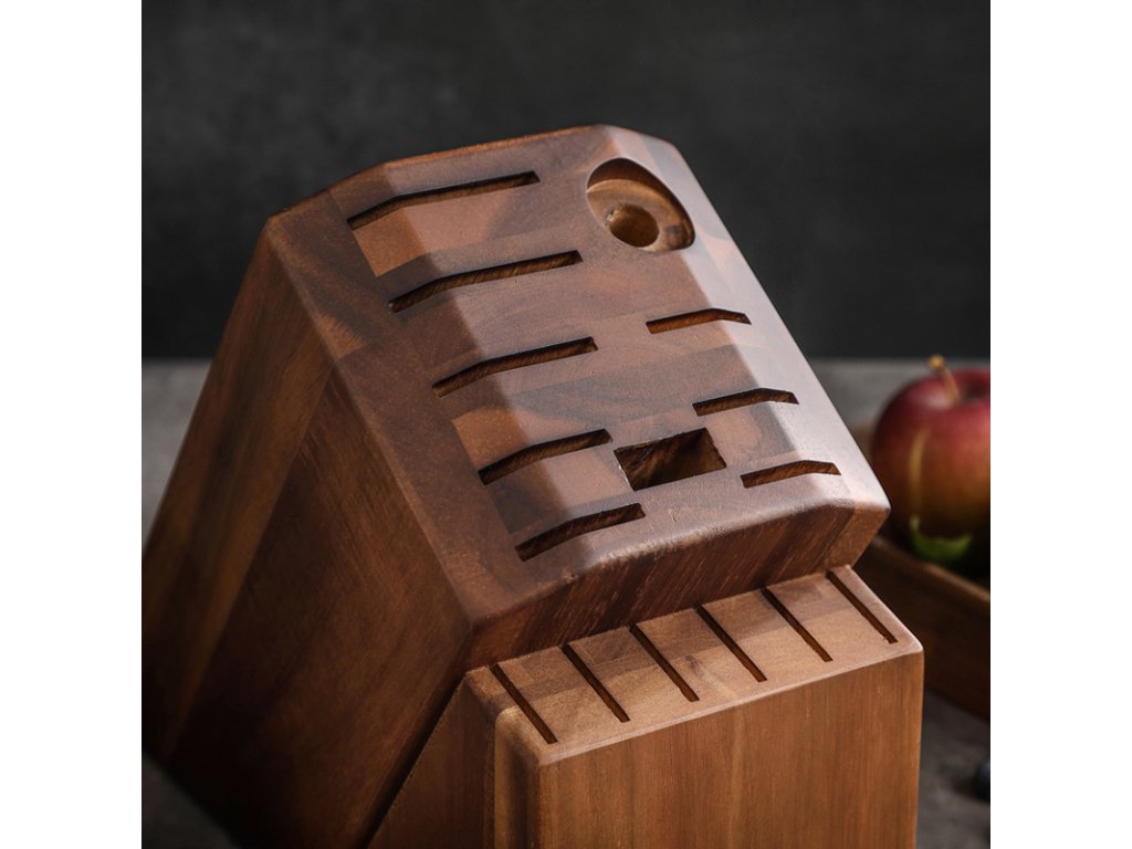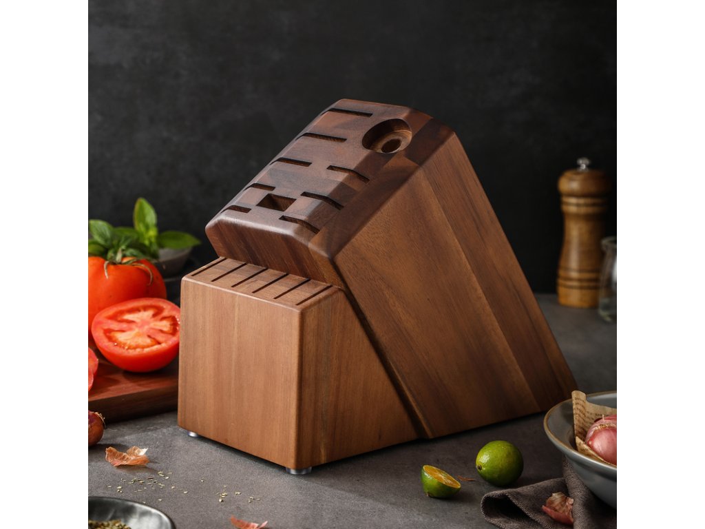 Der robuste XinZuo-Messerblock aus Akazienholz, der bis zu 14 Küchenmesser, einen Wetzstahl und eine Geflügelschere aufnimmt.