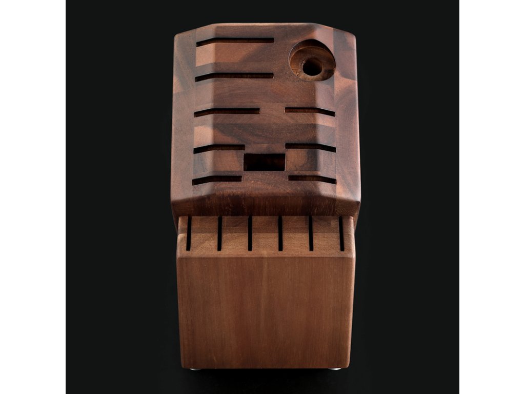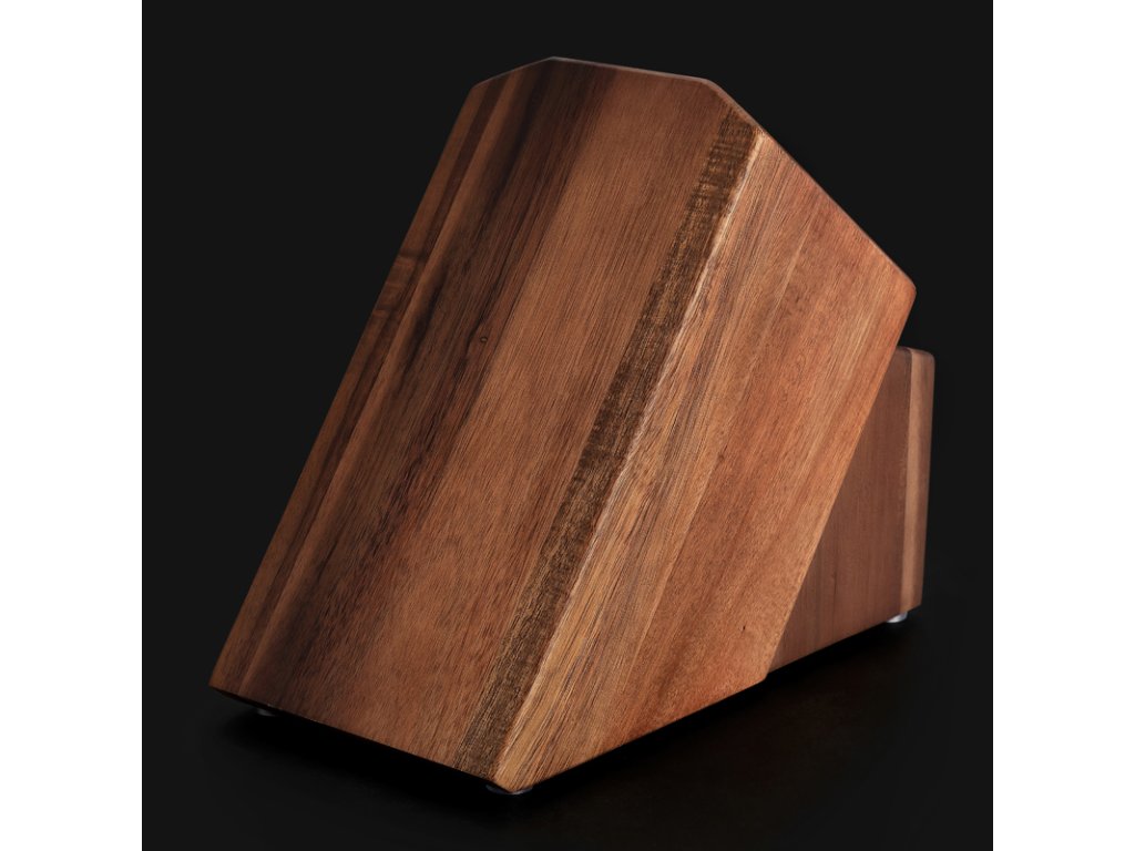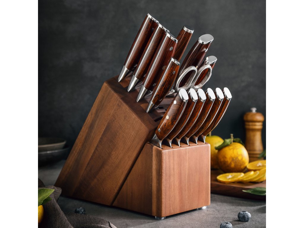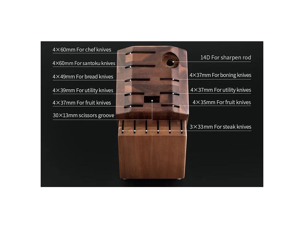 Der robuste XinZuo-Messerblock aus Akazienholz, der bis zu 14 Küchenmesser, einen Wetzstahl und eine Geflügelschere aufnimmt.