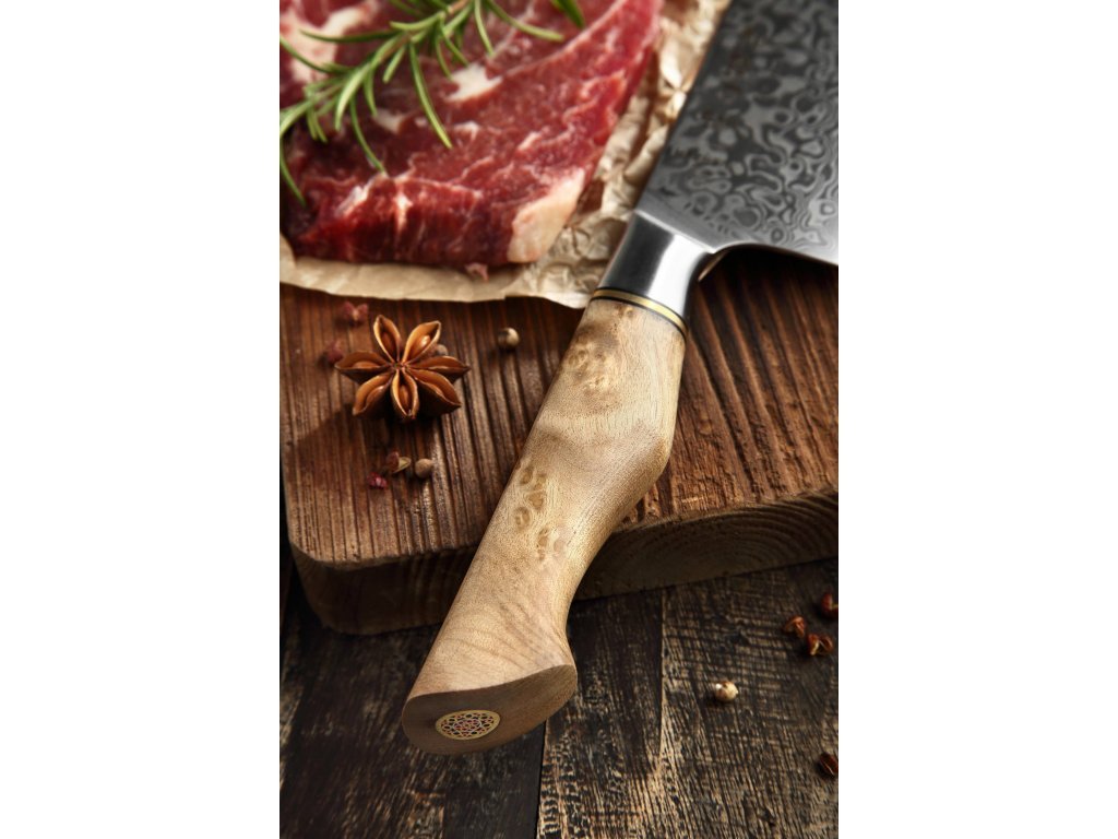 Der Griff der Serie HEZHEN Master B30 kann als Kunstwerk betrachtet werden. Er wurde mit dem Schwerpunkt auf Ergonomie und einem bequemen Griff entwickelt. Sie können ihn also auch für längere Zeit bequem und mit perfektem Gleichgewicht halten. Dank der einzigartigen Form und Ergonomie des Griffs werden ihn sowohl Links- also auch Rechtshänder schätzen zu wissen. Der Griff ist aus hochwertigem Palisanderholz gefertigt, das für seine Langlebigkeit auch in feuchten Umgebungen bekannt ist. Es wird mit der Zeit nicht weicher, reißt nicht und erbleicht nicht. Die Messer sind für den täglichen Gebrauch konzipiert und haben eine lange Lebensdauer, wie die Klinge, so auch der Griff. Das einzigartige Griffdesign wird durch einen Kupferring und eine kunstvolle Mosaikniete akzentuiert. Aufgrund des natürlichen Griff-Designs kann die Farbe und das Design leicht von den Produktbildern abweichen, da der Griff aus einem anderen Holzstück gefertigt wurde oder da das Alter des Holzes unterschiedlich ist (Farbe, Farbton, Maserung und Grobheit.)