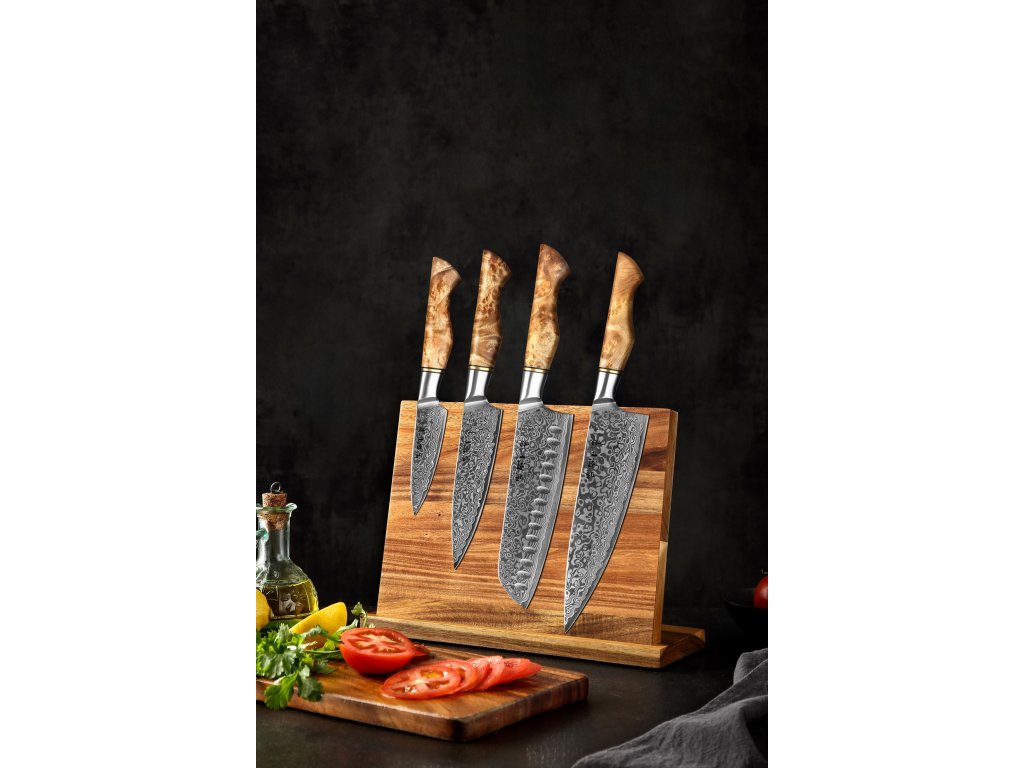 Messerset mit 4 Küchenmessern HezHen Master B30 aus Damaszenerstahl mit ergonomischem Holzgriff, inklusive Zubehör in Form eines magnetischen Holzblocks.