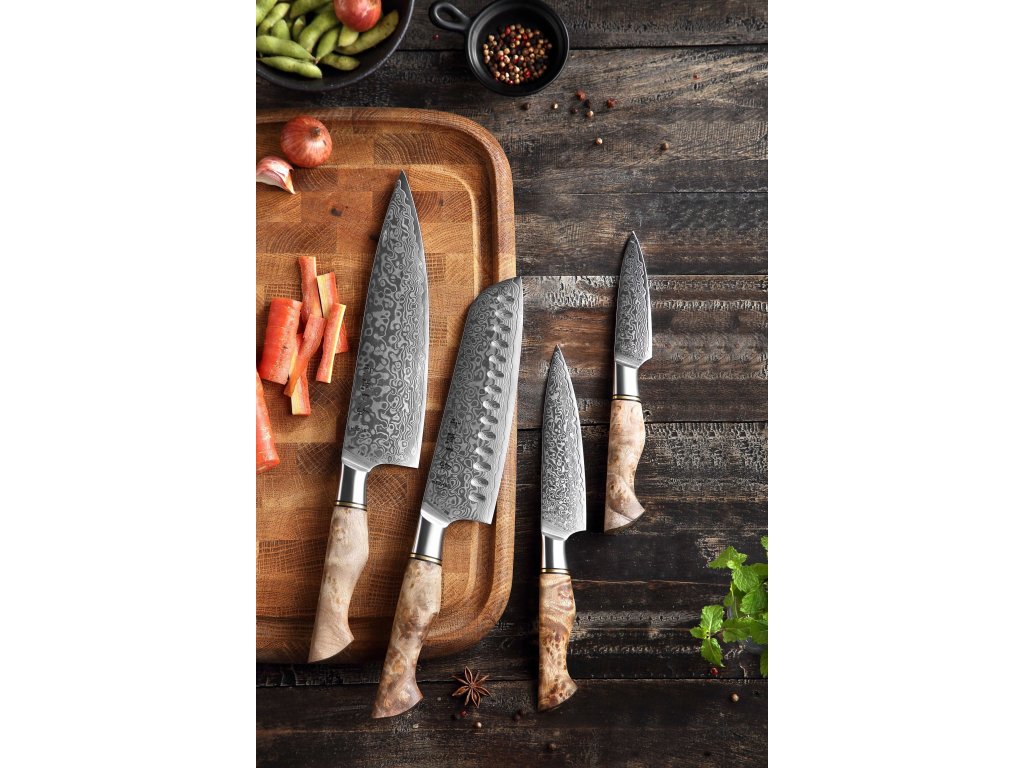 | Messer im Set: | Santoku, Kochmesser, Gemüsemesser, Schälmesser |