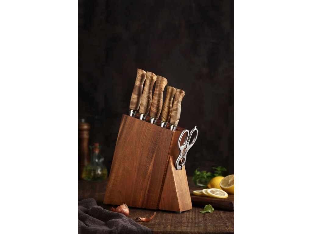 Das Messerset HezHen Master besteht aus Messern der Serie B30, die aus der traditionellen chinesischen Messerstadt Yangjiang stammen, wo seit Jahrhunderten die feinsten Messer hergestellt werden. Die lokalen Messerschmiede haben ihre Fertigkeiten in der Messerherstellung und -bearbeitung von Generation zu Generation weitergegeben. XinZuo verwendet das Beste aus der modernen und traditionellen Messerherstellung, um dieses Messerset herzustellen. Jedes Messer von XinZuo ist dank der abschließenden manuellen Präzisionsbearbeitung ein Unikat. Das Messerset HezHen Master B30 beinhält nicht nur hochwertige Messer, sondern auch einen Messerblock aus massivem Holz, der dank seinem natürlichen Design in fast jede Küche passt und einen luxuriösen Eindruck weckt. Es enthält außerdem eine praktische Mehrzweck-Geflügelschere.