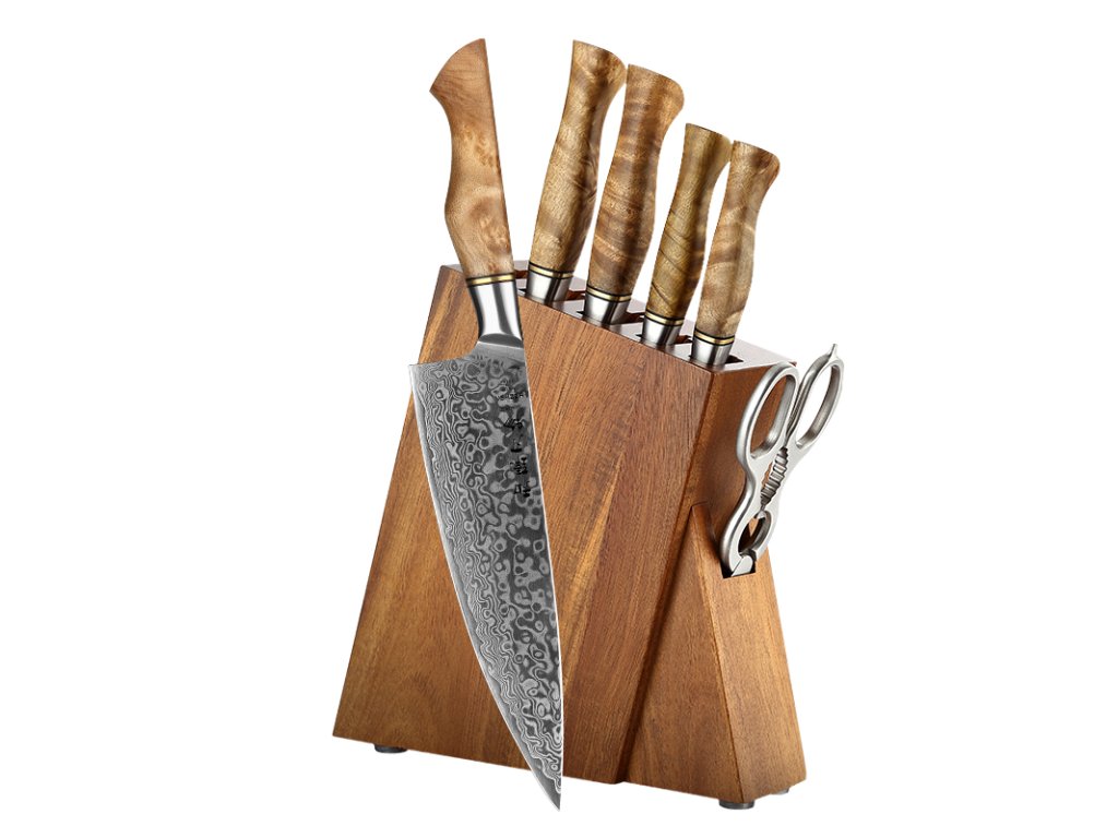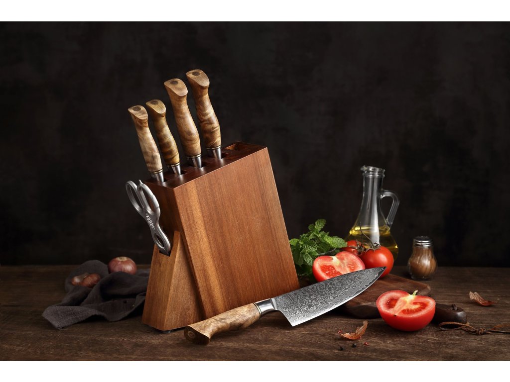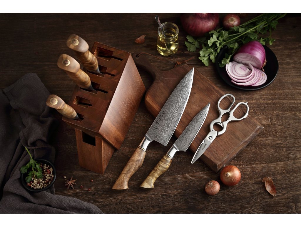 5-teiliges Messerset mit Küchenmessern HezHen Master B30 aus Damaszener Stahl mit ergonomischem Holzgriff, inklusive Zubehör in Form einer Schere aus Edelstahl und eines massiven Holzblocks.