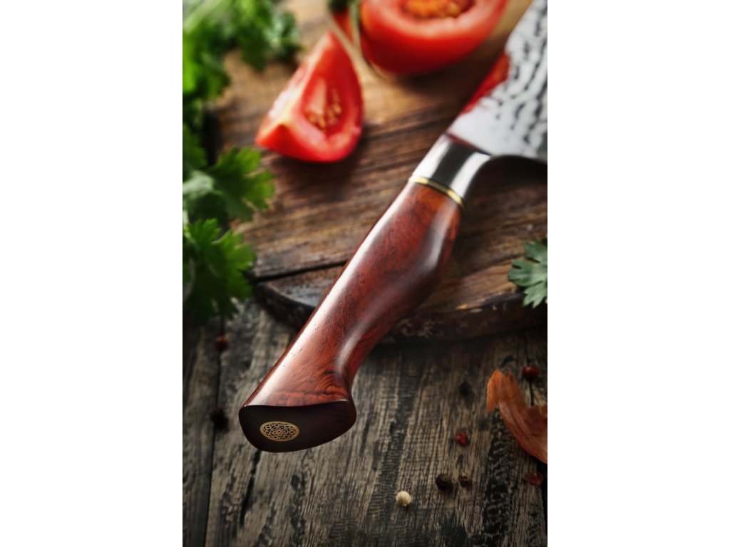 Der Griff der Messerserie HEZHEN Master B30R kann als Kunstwerk betrachtet werden. Er wurde mit dem Schwerpunkt auf Ergonomie und einem bequemen Griff entwickelt. Sie können ihn also auch für längere Zeit bequem und mit perfektem Gleichgewicht halten. Dank seiner einzigartigen Form und Ergonomie werden ihn sowohl Links- also auch Rechtshänder schätzen zu wissen. Der Griff ist aus hochwertigem Palisanderholz gefertigt, das für seine Langlebigkeit auch in feuchten Umgebungen bekannt ist. Dieses Holz wird mit der Zeit nicht weicher, reißt nicht und erbleicht nicht. Das Messer ist für den täglichen Gebrauch konzipiert und hat eine lange Lebensdauer, wie die Klinge, so auch der Griff. Die HEZHEN-Messer der Serie Master B30R fallen auf den ersten Blick ins Auge und sind dank der einzigartigen Form des Griffs und des unkonventionellen Aussehens, auf das großer Wert gelegt wurde, von jeder anderen Messerserie leicht zu unterscheiden. Das einzigartige Griffdesign besteht aus einem Kupferring und einer kunstvollen Mosaikniete. Aufgrund seines natürlichen Designs kann die Farbe und das Aussehen leicht von den Produktbildern abweichen, da der Griff aus einem anderen Holzstück gefertigt wurde oder da das Alter des Holzes unterschiedlich ist.