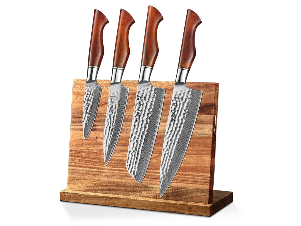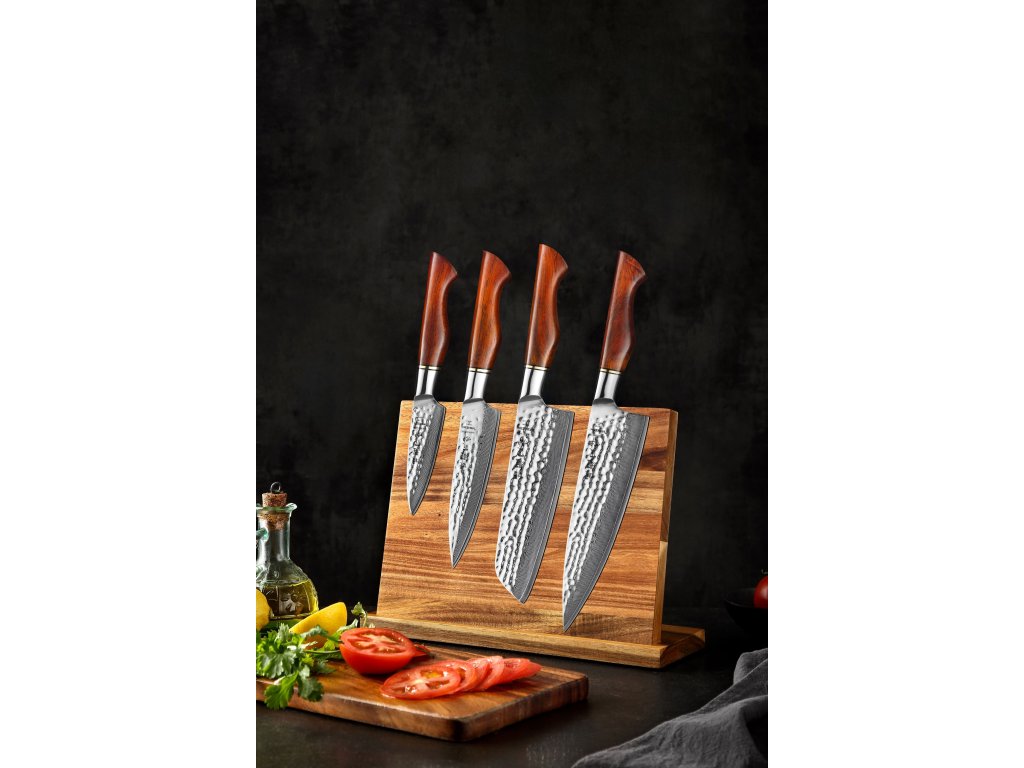 Messerset mit 4 Küchenmessern HezHen Master B30R aus Damaszener Stahl mit ergonomischem Holzgriff, inklusive Zubehör in Form eines magnetischen Holzblocks.