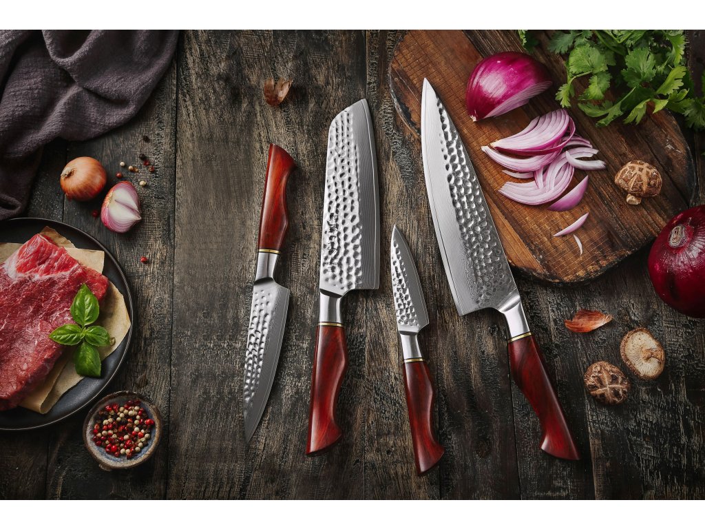 | Messer im Set: | Santoku, Kochmesser, Gemüsemesser, Schälmesser |