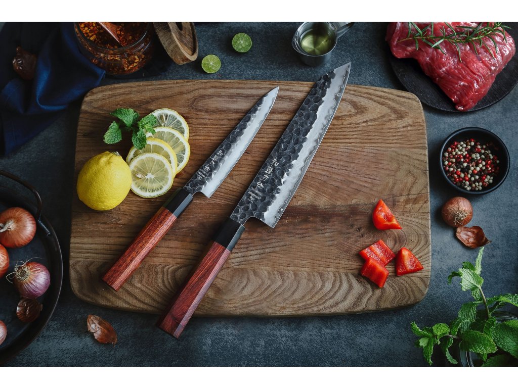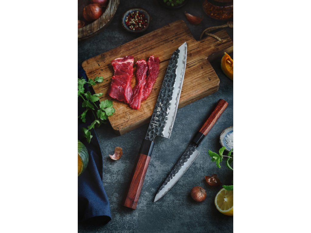 Der Griff der HEZHEN-Messer aus der PM8S-Serie hat den gleichen Retro-Look wie die Klinge. Mit seiner traditionellen Form im japanischen Retro-Stil wurde er mit dem Schwerpunkt auf Ergonomie und einem bequemen Griff entwickelt. Sie können ihn also auch für längere Zeit bequem und mit perfekter Balance halten. Dank der bewährten achteckigen Form werden diese Messer sowohl Links- und Rechtshänder schätzen zu wissen. Der Griff ist aus hochwertigem Palisanderholz gefertigt, das für seine Härte bekannt ist. Es wird mit der Zeit nicht weicher, reißt nicht und erbleicht nicht. Die Messer sind für den täglichen Gebrauch konzipiert und haben eine lange Lebensdauer, wie die Klinge, als auch der Griff. Aufgrund des natürlichen Griff-Designs kann die Farbe und das Aussehen leicht von den Produktbildern abweichen, da der Griff aus einem anderen Holzstück gefertigt wurde oder da das Alter des Holzes unterschiedlich ist.