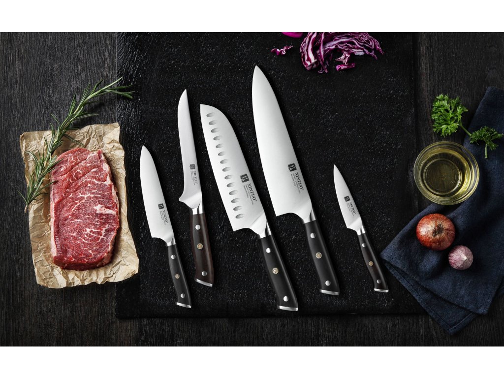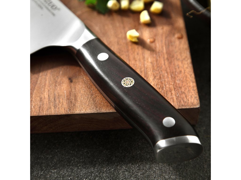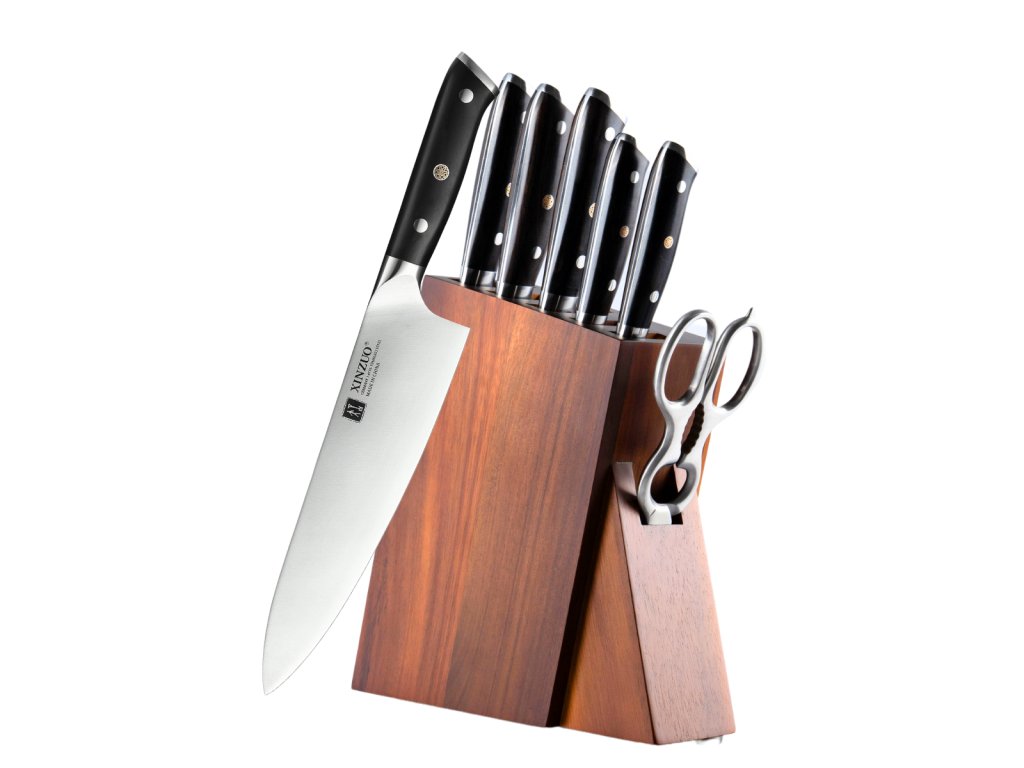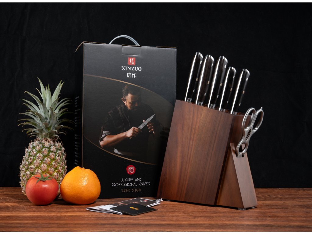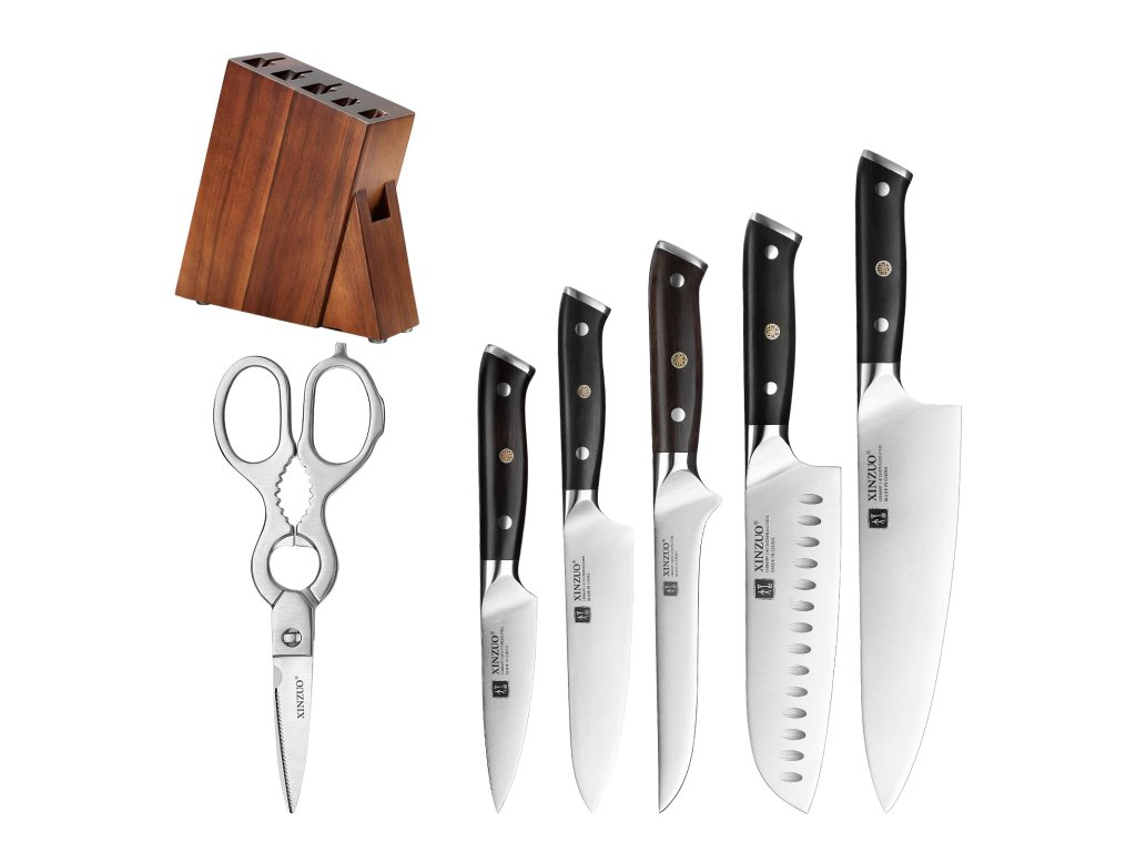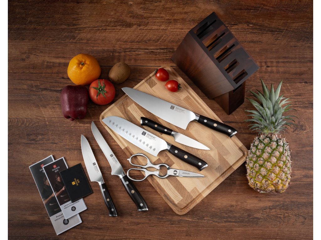 Hochwertiges Messerset XinZuo Yu B13S mit 5 Messern aus deutschem Stahl und Griffen aus Ebenholz kommen mit klassischem Messerblock und einer Geflügelschere.