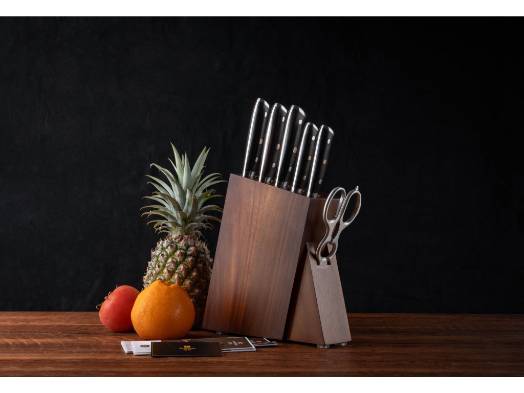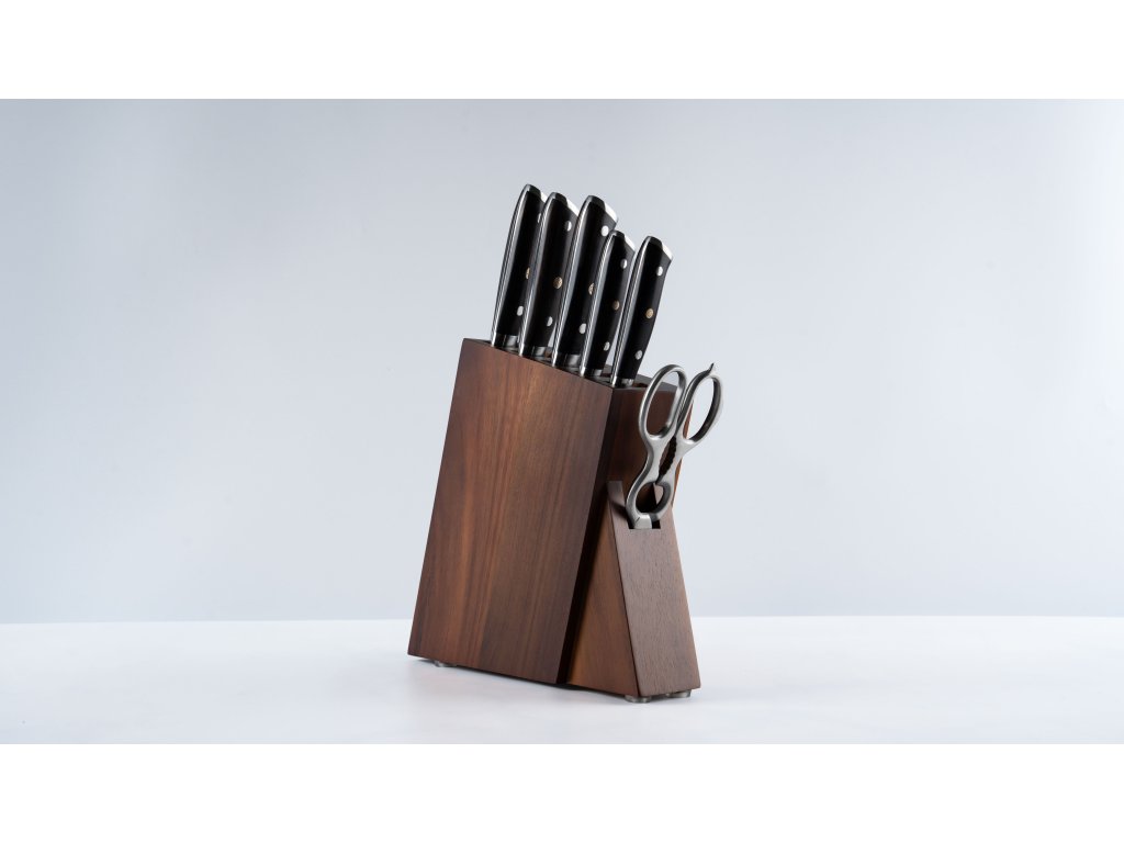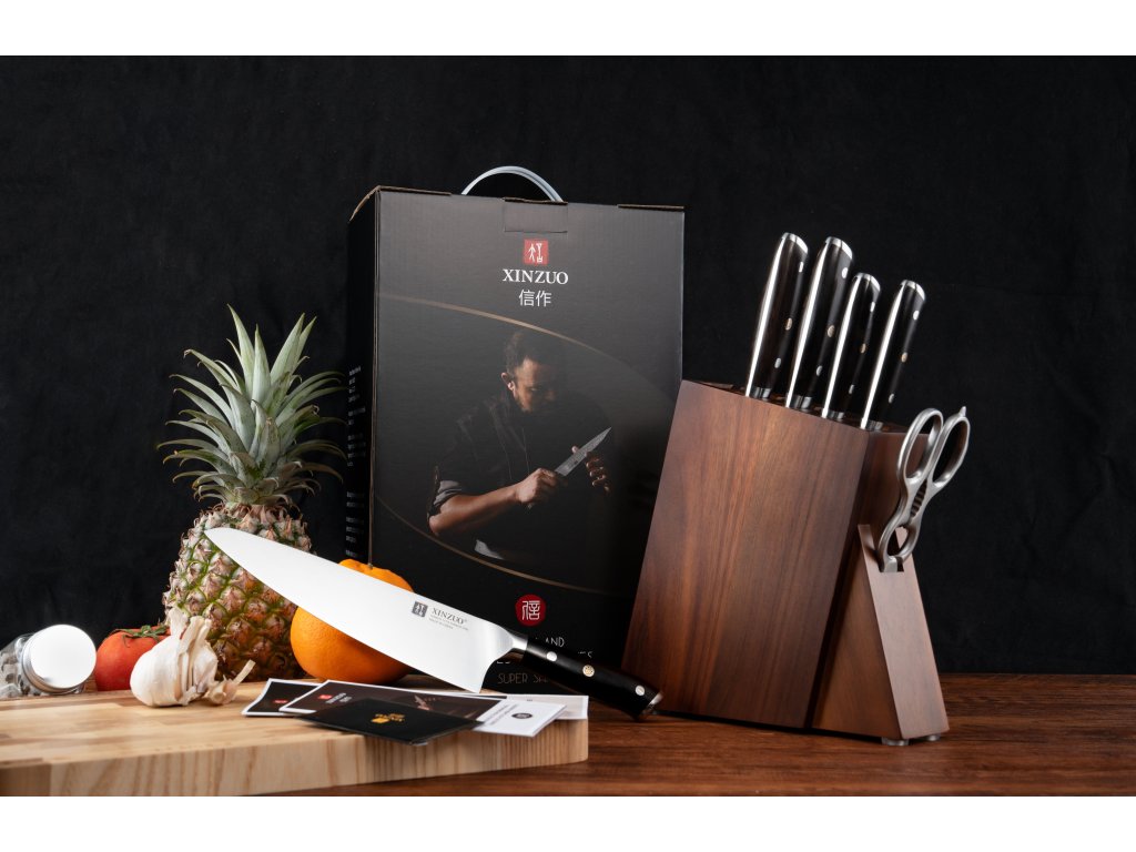 Das Messerset XinZuo besteht aus Messern der Serie Yu B13S, die aus der traditionellen chinesischen Messerstadt Yangjiang stammen, wo seit Jahrhunderten die feinsten Messer hergestellt werden. Die lokalen Messerschmiede haben ihre Fertigkeiten in der Messerherstellung und -bearbeitung von Generation zu Generation weitergegeben. XinZuo verwendet das Beste aus der modernen und traditionellen Messerherstellung, um dieses Messerset herzustellen. Jedes Messer von XinZuo ist dank der abschließenden und präzisen manuellen Bearbeitung ein Unikat. Das Messerset XinZuo Yu B13S beinhält nicht nur hochwertige Messer, sondern auch einen eleganten klassischen Messerblock aus Holz, das dank seinem natürlichen Design in fast jede Küche passt. Das Set enthält auch eine Mehrzweck-Geflügelschere.