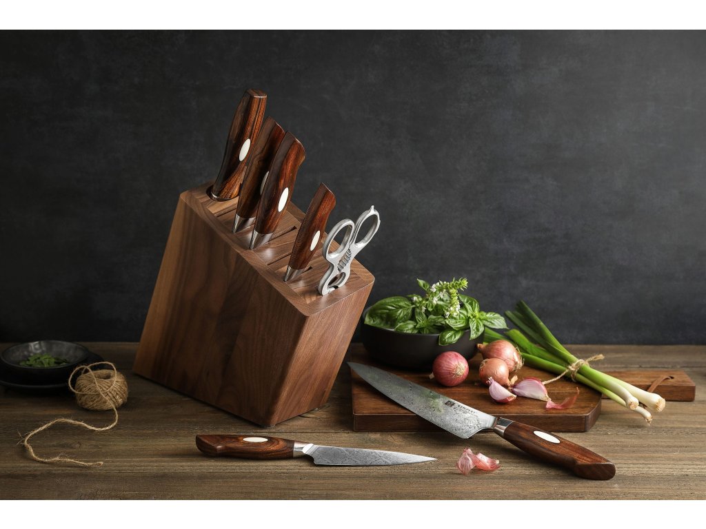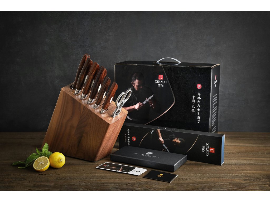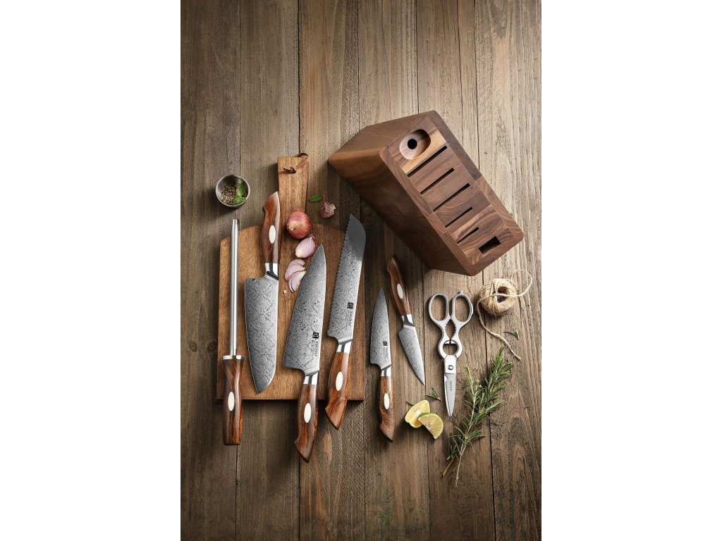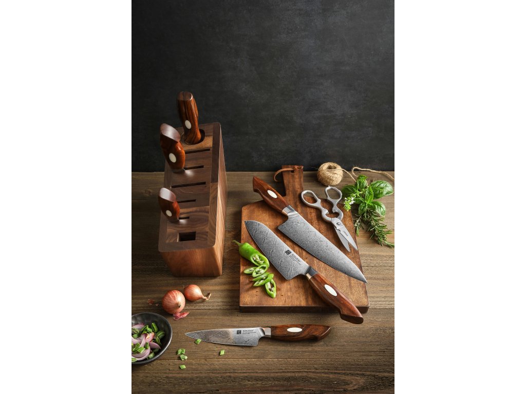 Ein Set aus fünf Messern XinZuo Jiang B46D mit einer einzigartigen Klinge aus zwei verschiedenen Damaszener Stählen und einem Griff aus Massivholz. Das Set kommt mit einem massiven Holzblock, einem Wetzstahl und einer Geflügelschere. Es enthält auch die meistverwendeten Messer für die Zubereitung der österreichischen Gerichte.