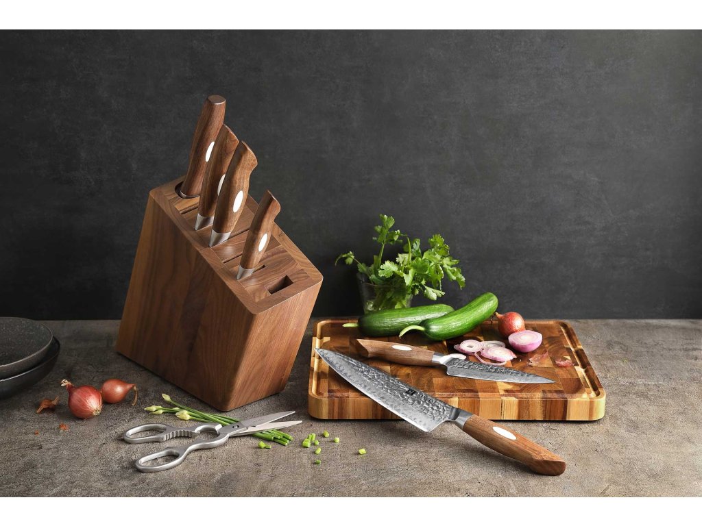 Das Messerset XinZuo Jiang besteht aus Messern der Serie B46D, die aus der traditionellen chinesischen Messerstadt Yangjiang stammen, wo seit Jahrhunderten die feinsten Messer hergestellt werden. Die lokalen Messerschmiede haben ihre Fertigkeiten in der Messerherstellung und -bearbeitung von Generation zu Generation weitergegeben. XinZuo verwendet das Beste aus der modernen und traditionellen Messerherstellung, um dieses Messerset herzustellen. Jedes Messer von XinZuo ist dank der abschließenden und präzisen manuellen Bearbeitung ein Unikat. Das Messerset XinZuo Jiang B46W beinhält nicht nur hochwertige Messer, sondern auch einen eleganten Messerblock aus Akazienholz, das dank seinem natürlichen Design in fast jede Küche passt und einen luxuriösen Eindruck weckt. Es enthält außerdem eine praktische Mehrzweck-Geflügelschere und einen Wetzstahl.
