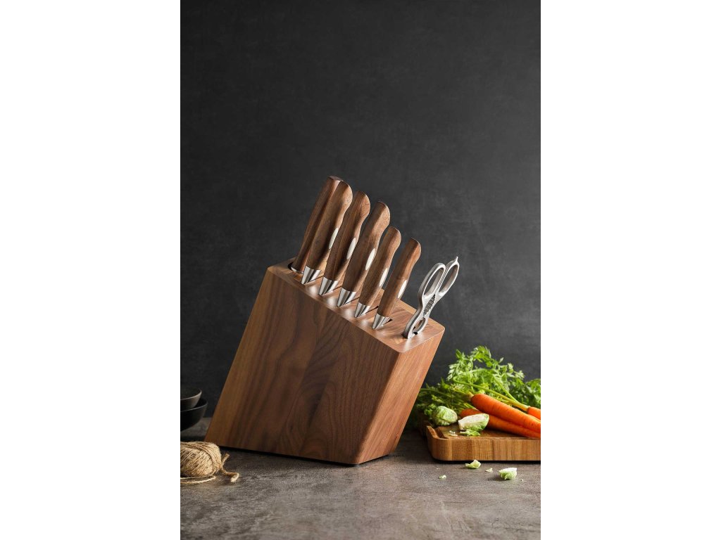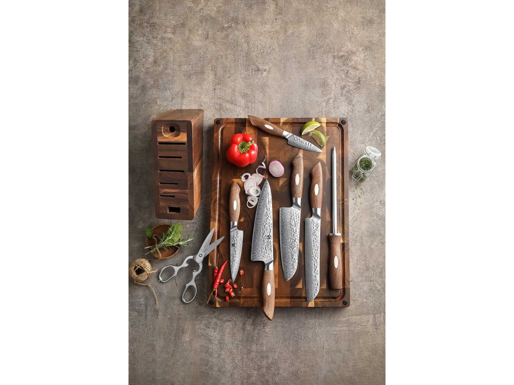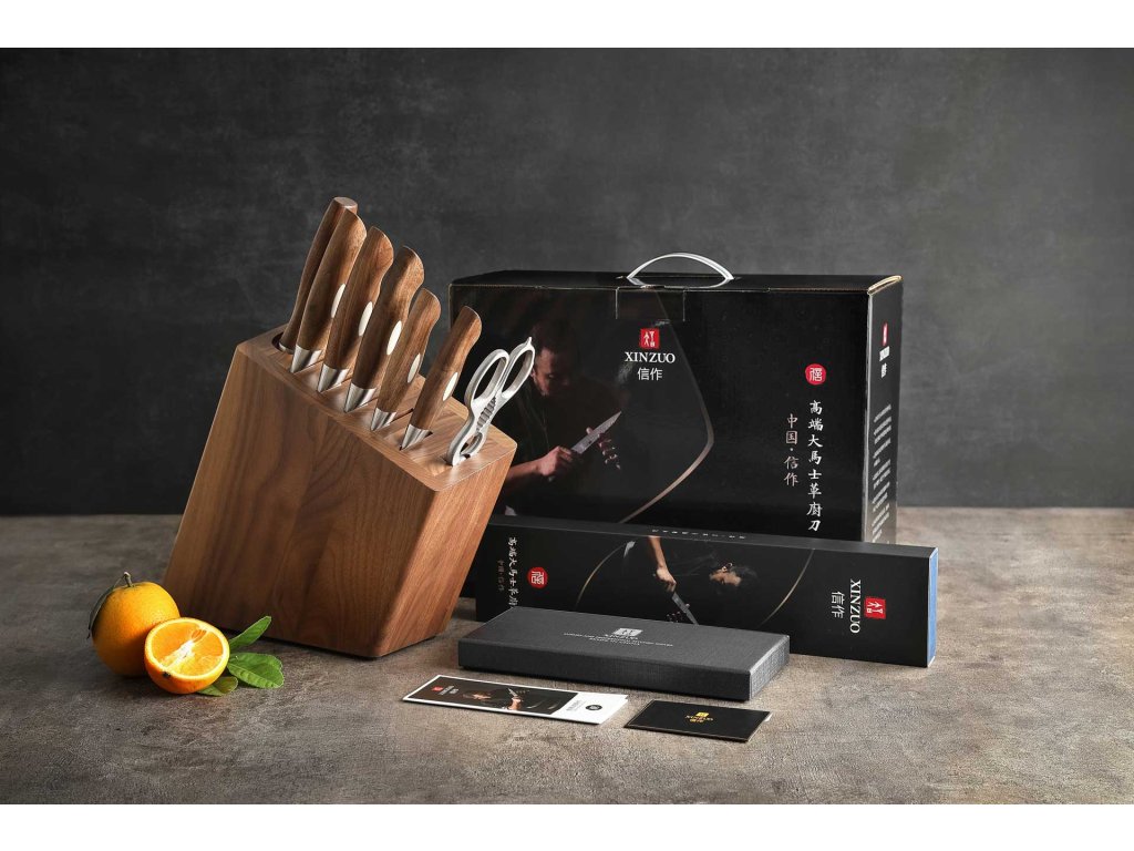 Messerset mit 5 Messern XinZuo Jiang B46W mit einer Klinge aus berühmten japanischen Stahl AUS10 und einem Griff aus elegantem Walnussholz. Das Messerset beinhält einen massiven Holzblock, einen Wetzstahl und eine Geflügelschere. Es enthält auch die meistverwendeten Messer für die Zubereitung der österreichischen Gerichte.