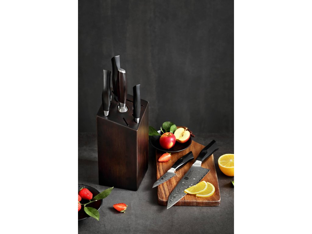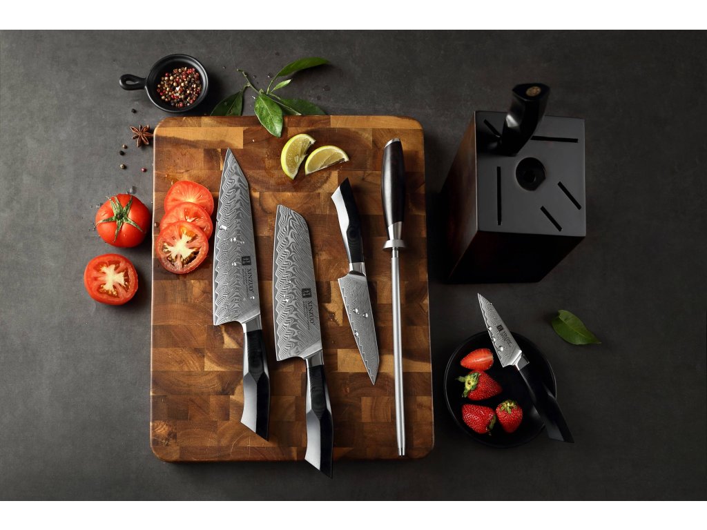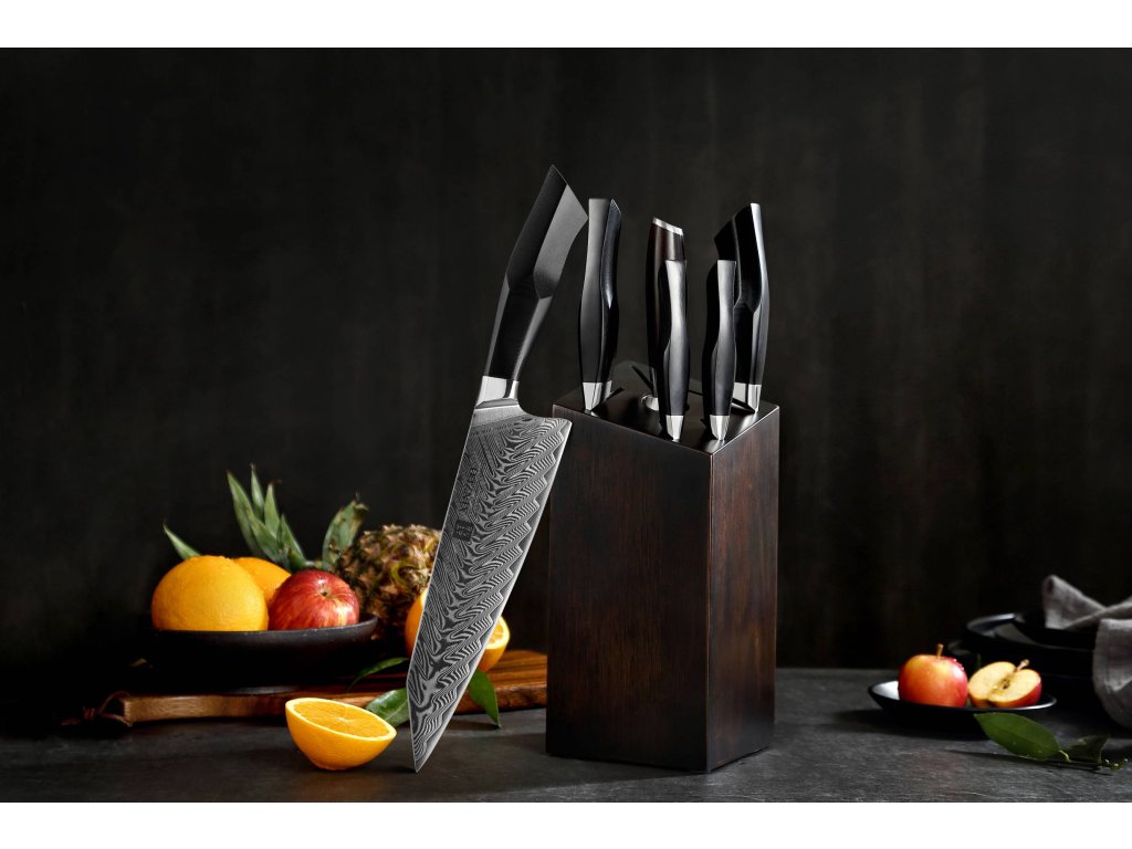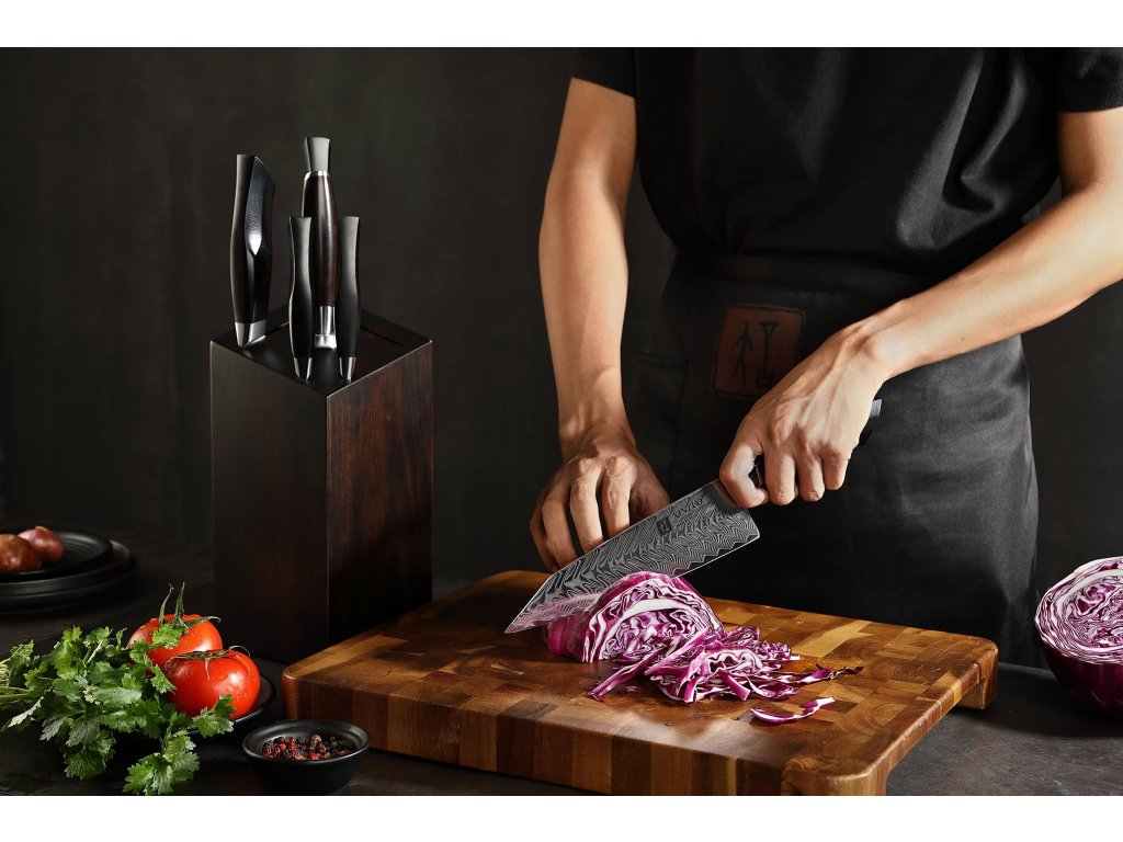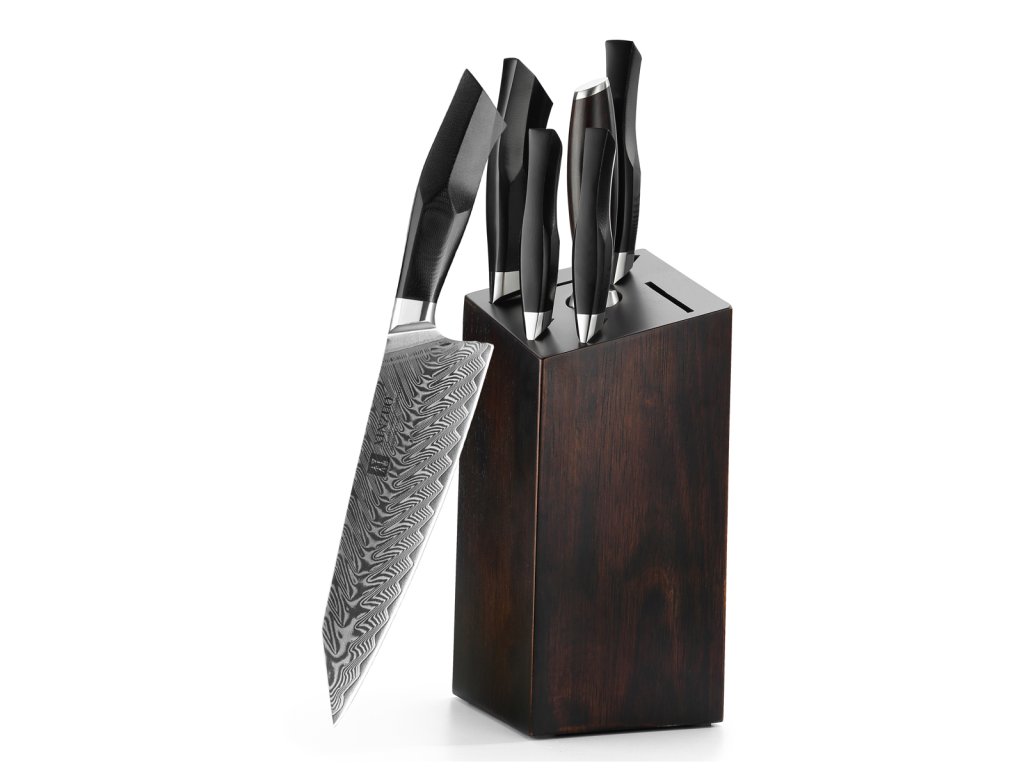 In diesem Set sind die Messer aus hochwertigem Damaszener Stahl gefertigt – dieser wird für die Herstellung der besten Messer verwendet. Deren Messerklinge mit einer Härte von 60±2 Rockwell besteht aus 67 Lagen. Der hochwertige Stahl in einer Kombination von traditioneller Herstellung verleiht dem Messer eine lange Lebensdauer. Die Oberfläche des Messers bietet beim Schneiden Komfort, ohne dass es reibt oder dass die Zutaten an die Klinge pappen. Der Messergriff besteht aus wartungsfreiem Material, das mit der Zeit weder weicher wird noch Geruch annimmt. Dank seiner perfekten Form und Länge wird das Schneiden zum Vergnügen und außerdem liegt das Messer gut in der Hand. Aufgrund des natürlichen Griff-Designs kann die Farbe und das Design leicht von den Produktbildern abweichen, da der Griff aus einem anderen Holzstück gefertigt wurde oder da das Alter des Holzes unterschiedlich ist. Der Farbton des Musters auf der Klinge kann von den Produktfotos abweichen, da jedes Messer durch das Stahlschichten einzigartig ist. Zum Set gehört sowohl ein eleganter Block aus Massivholz mit Gummifüßen, die auf der Küchenzeile nicht Verrutschen, als auch einem Wetzstahl.