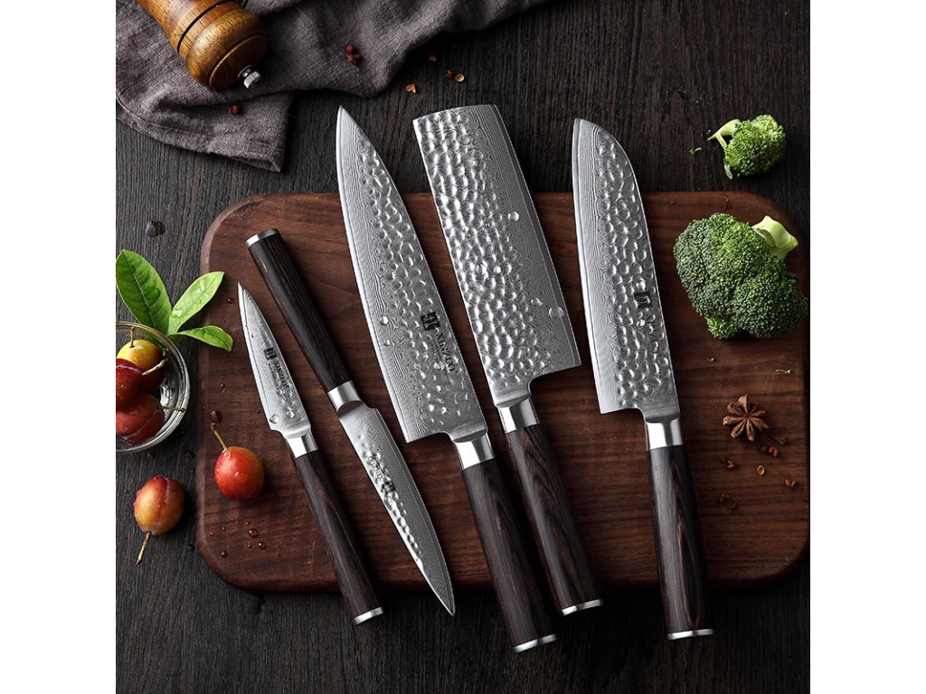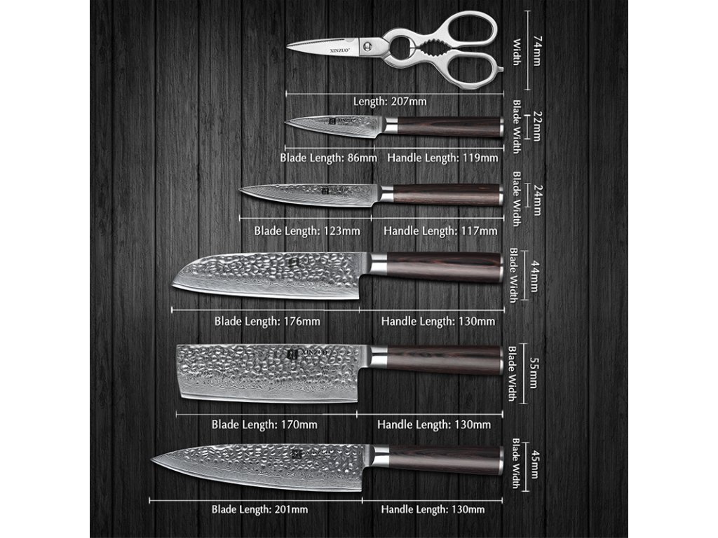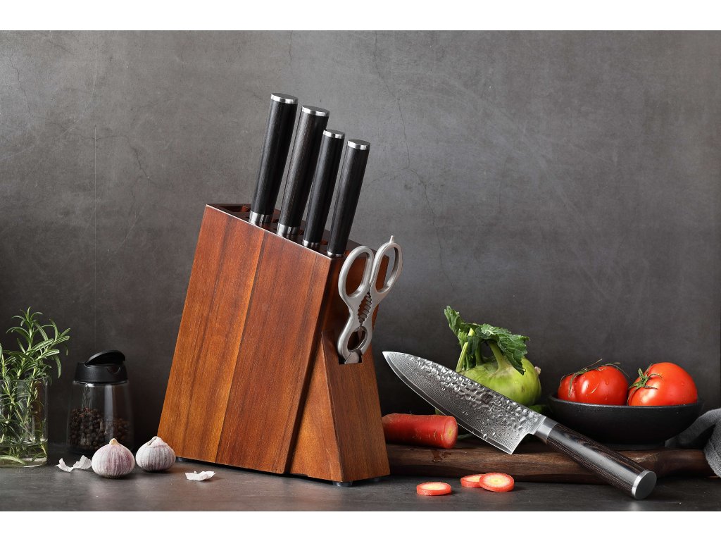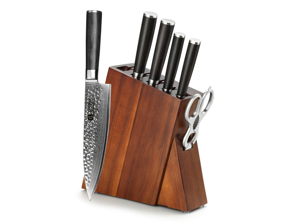 Messerset He B1H von XinZuo besteht aus 5 hochwertigen Messern aus Damaszener Stahl, hölzernem Messerblock und praktischer Mehrzweck Schere zum Tranchieren von Geflügel.