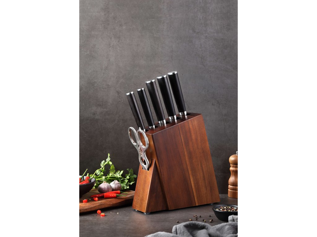 In diesem Set sind die Messer aus hochwertigem Damaszener Stahl gefertigt, der für die Herstellung der besten Messer verwendet wird. Deren Messerklinge mit einer Härte von 60±2 Rockwell besteht aus 67 Schichten. Hochwertiger Stahl in einer Kombination von traditioneller Herstellung garantiert eine lange Lebensdauer des Messers. Die Oberfläche des Messers bietet beim Schneiden Komfort, ohne dass es reibt oder dass die Zutaten an die Klinge pappen. Der Messergriff besteht aus wartungsfreiem Material, das mit der Zeit weder weicher wird noch Geruch annimmt. Dank seiner perfekten Form und Länge wird das Schneiden zum Vergnügen und außerdem liegt das Messer gut in der Hand. Aufgrund des natürlichen Griff-Designs kann die Farbe und das Design leicht von den Produktbildern abweichen, da der Griff aus einem anderen Holzstück gefertigt wurde oder da das Alter des Holzes unterschiedlich ist. Der Farbton des Musters auf der Klinge kann von den Produktfotos abweichen, da jedes Messer durch das Stahlschichten einzigartig ist. Das Set enthält außerdem einen Holzblock und eine Geflügelschere aus Edelstahl 3Cr14.