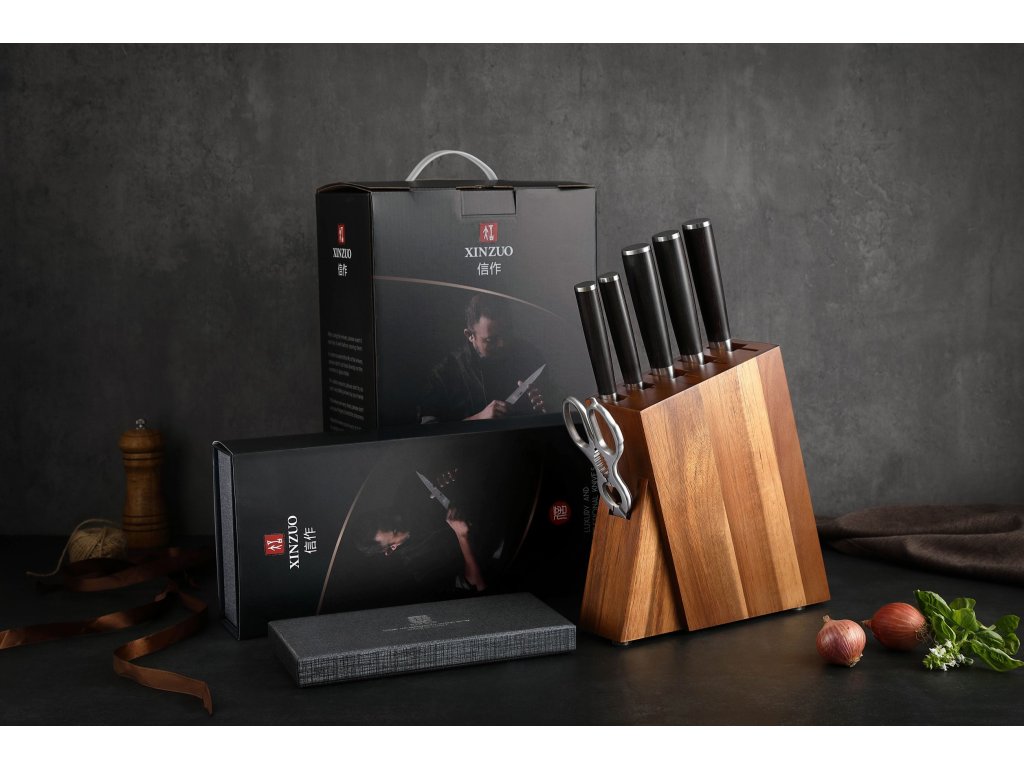 Das Messerset XinZuo besteht aus Messern der Serie He B1H, die aus der traditionellen chinesischen Messerstadt Yangjiang stammen, wo seit Jahrhunderten die feinsten Messer hergestellt werden. Die lokalen Messerschmiede haben ihre Fertigkeiten in der Messerherstellung und -bearbeitung von Generation zu Generation weitergegeben. XinZuo verwendet das Beste aus der modernen und traditionellen Messerherstellung, um dieses Messerset herzustellen. Jedes Messer von XinZuo ist dank der abschließenden und präzisen manuellen Bearbeitung ein Unikat. Das Messerset XinZuo He B1H beinhält nicht nur hochwertige Messer, sondern auch einen eleganten klassischen Messerblock aus Holz, das dank seinem natürlichen Design in fast jede Küche passt. Das Set enthält auch eine Mehrzweck-Geflügelschere.
