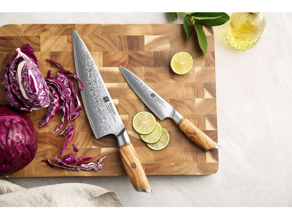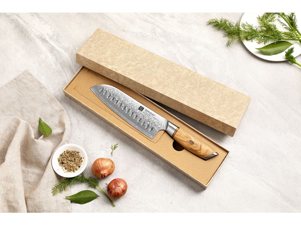 Die Messerserie XinZuo Lan B37 zeichnet sich durch die Betonung der Ergonomie aus, einschließlich der abgerundeten unteren Ecke der Messerklinge für größere Sicherheit beim Schneiden. Dank des ergonomischen Griffs aus Olivenholz liegen die Messer nicht nur gut in der Hand, sondern sind auch ein Design-Stück mit natürlichem Look.